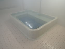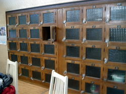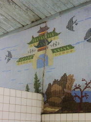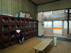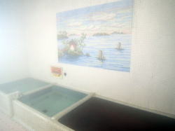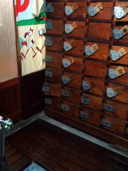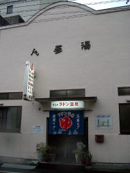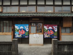 豊橋駅から徒歩数分。電車通りを東へ歩き、新川交差点の1本手前を右折してしばらく行くと、静かな街角に1軒の古風な銭湯あり。 ![]() (左)破風玄関の下に屋号の看板 (右)暖簾をくぐるとこれまた古風な下足室がこぢんまり 木の番台に鄙びたばあさんが座るのも典型的なイニシエ風景。 高い天井は升目の大きな格子状になっており、ニス塗りの板張り床にはよけいなものがいっさい置かれていない。そしてロッカーも木でできた古いもの。揃いも揃って泣かせるぜ。 浴室への戸は新しいガラス戸になっている。開けてみたら、浴室の床、カランまわり、湯舟は新しいタイルで改装されている。手前にスチームサウナがあり、湯舟は手前から水・デンキ(広い)・深・浅(ジェット2連)が並んでいて、俺的には十分な設備だ。 といいつつ、ハコそのものは古いままだ。東京っぽい大きな二段式天井はライトグリーンのペンキがハゲハゲ。奥壁には岩が貼り付けられ、その上には洋画風のモザイクタイル絵があるが、ひび割れてくすんでいる。 新旧混合の微妙なブレンド空間は、途中から貸し切り状態になった。 あ〜ここはどこやったかな、豊橋か。ははは、俺なんでこんなとこにおんねやろ。ほろ酔いのヌケサクはお湯にだらっと浸かったまま、いつまでもボーッとしておったのじゃった。 (2007.4.7) |