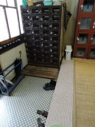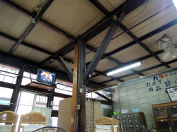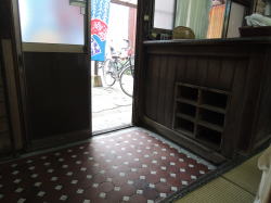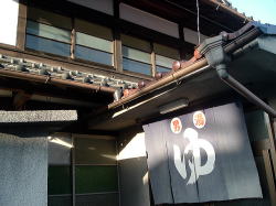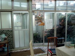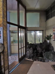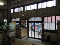 犬山市で唯一の銭湯だ。 名鉄犬山駅から南西へ徒歩10分たらずの細い路地に、先っぽの欠けたような煙突が見える。近づくと、黙ってたたずむ古い建物。増設されたような玄関破風の両脇で、「ゆ」の暖簾が遠慮がちに揺れている。 ![]() (左)銭湯のある通り (右)夕日に映える暖簾 暖簾をくぐると狭い玄関スペースに木の下駄箱があって、鍵もちゃんとついている。 すりガラスの戸を開けて入ると番台があるが、誰もおらん。呼んでも返事がないので、そこに380円を置いて勝手に入る。 それにしてもこの番台、タイル貼りだ。珍しいな。 ((左)スキマの空いた下駄箱と、入口 (右)タイル張りの番台こじんまりした脱衣所には、椅子とテーブルのセットが置かれ、壁には使い込まれた木のロッカー。真ん中にガラスがはめられたタイプ(東海地方に多い)だが、ここのガラスは格子柄だ。 ここも脱衣所と浴室は別棟になっていて、連結部分は半分が通路、半分が庭になっている。 通路には湯も出る流しがあり、庭には池があって金魚が泳いでいる。 ![]() (左)壁にはめ込まれた脱衣箱 (右)連結部分、右側の中庭には岩が積まれている 裸になって浴室へ。あぁ、なんか「田舎の風呂」って感じで、ホッと力が抜けるなあ。ゆるーいカマボコ天井に、長方形の小さめ湯気抜きが空いている。 湯舟はいくつかあるぞ。主浴槽は男女仕切り側に細かいタイル使いの深浅、四すみやヘリがカーブしてやさしい感じ。 入ってみると内側は3段になっている。これは広島の銭湯以来だ。しかも、内側もすべての角がやさしくカーブしている。42〜43度、マイベスト湯温。 手前の中庭に面して薬湯。ぬるめで、ヨモギ入りの袋が入っており、けっこう濃い。これはカユミに効きそうだ。中庭を眺めながらのんびりできる。 奥には電気湯もあり。 奥壁一面にモザイクタイル絵がある。大きな川の渓谷図、この近くの木曽川の日本ラインかなと思ったが、下のほうに角張った建物が配されている。ゴミ焼却場か下水処理場みたいに見えるが、なんでそんなものを・・・ん? もしかしてドイツの古城か! そうか。本場ライン下りを描いたつもりなのだろう。 カラン・シャワーの水圧もよし。 上がると、ほがらかなおかみさんがいた。犬山の観光名所をいろいろ教えてくれて、名産のげんこつ飴を2つぶくれた。そして、ちょうど帰りがけの常連客のばあさんが、げんこつ本舗「厳骨堂」に案内してくださるというオマケもついた。 人情豊かな、あったかい銭湯だ。国宝・犬山城とともに、犬山の宝として末永く営業されることを願う。 (2006.3.15) ![]() |