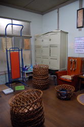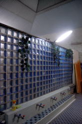 JR黒崎駅から東へ歩いて線路を北へくぐり、右折する。 ゆるくくねった狭い道を5分ほど歩いたところで突如、金縛り発作に見舞われた。 これは銭湯なのか? 百戦錬磨フロバカ野郎の俺様をして、過去に見たことのない風貌の銭湯が忽然と現れた。 小ぶりな建物全体がレンガ造りのようだが、ただのレンガではない。色は暗い灰色で、質感がゴチッとしてるのよゴチッと。 これが噂に聞く鉱滓レンガというやつか。 ぶつかったら骨折確実この硬質感と重量感、そして全面や側面に開けられた小さな窓など、まるでトーチカを思わせるような防衛力に身震いしそうな興奮を覚える。 建物の横奥に燃料の廃材が積んである。 ![]() (左)入口は玄関の両サイド (右)2段下がって入る ドアを開けて入ると正面に番台があって、柔和なおかみさんが座っている。脱衣場からは少し奥まったように見える位置だ。 小さなタタキに靴を脱いで脱衣場へ上がると、使い込まれた木の床が足裏に心地よい。外観とは異なって、見慣れた感じのこぢんまりとした素朴な脱衣場風景だ。 脱衣箱がないため、狭い感じがしない。 ![]() (左)番台とタタキ周辺 (右)タタキの床タイルと木の下駄箱が渋い ![]() (左)浴室入口は水色ペンキ広島風 (右)脱衣籠と貴重品ロッカーのコンビ ![]() (左)いにしえ〜な鏡 (右)そして浴室 浴室は意外に、といってはナンだけどカラフルですっきりしている。中央に角なし長方形の主湯がポンとあり、ちょうどエエ按配の湯が沸いている。奥の副浴槽は使われておらずカラッポ。 カランまわりは適度に改装され、6人分のうち4つにはハンドシャワーもついていて使い勝手は悪くない。 ![]() (左)この外側はあの鉱滓レンガ壁ね (中)男女壁上部は摺りガラス (右)奥から脱衣場方面 相客は最初2人いたが途中から貸切になった。 しかしまあ寒風吹きすさぶ玄界灘にほど近い九州黒崎の街外れ、ゴチッとした鉱滓れんがに徹底的に守られた小さなシェルターでぬくぬくお湯に浸かっているという異次元状況は何ともいえん。わしゃこんなとこで何しとる? 上がって聞くと、おかみさんは昭和34年にここに来られたのでそれ以前のことはわからんとおっしゃる。が、84歳の常連客が「小さい頃ここで遊んだ」とおっしゃっているらしいから、少なくとも80年くらい前からはあったんだろう。 「もうやめようと思って浴室も直してないんです」 おかみさんはそうおっしゃるが、フロバカとしては日本滅ぶともこの頑丈で貴重な銭湯だけは戦火を行き抜き、未来永劫ここでお湯を沸かし続け人々を暖め続けてくださることを願うばかりだ。 (2012.1.5) 脱衣場に飾られたステキ絵 |