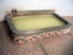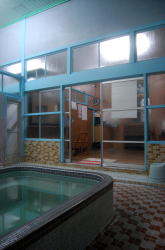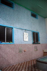 福岡県最南端、かつて三池炭鉱で栄えた大牟田へとやってきた。 山歩きでヘトヘトな上にJRのダイヤが大幅に遅れ、夜9時をまわって空腹のあまり目まいを覚えながらも、しぶとく銭湯を探して歩き回っている俺。もはや目がイッてるぜ。 大牟田駅から北北西に徒歩7〜8分。飲み屋などの集まる古い繁華街の真ん中に、レトロながらもモダンな香りが漂う古銭湯が忽然と現れた。 なんだかこの界隈の主のようなオーラだ。これはただごとじゃないぞ。細かいタイルの張り巡らされた正面姿にしばしクギヅケになる。 手前は角柱、奥は円柱が支える玄関部はやる気持ちを抑えて暖簾をくぐると、タタキ横の番台に穏やかな表情のおかみさんが座っている。 脱衣所はけっこう広々しているが、まあなんてことなく新建材でリニューアル済み。 それよりまず目についたのは、浴室入口のガラス戸が開けたままになってあることだ。 「開いてますけどいいんですか?」と聞くと、おかみさんはにっこり微笑んで、 「ええ、そのほうが湯気が抜けて涼しいでしょ」とおっしゃる。これは初めての経験かも。なんかちょっと感動。 でその開け放たれて丸見えの浴室だが・・・ああーもう俺今日ここに来てよかった! もうほんとこれはよかった来てすごいここに今日うまいこと来たほんとに何コレもう俺ここは・・・。 あ、あせるな俺、まず服を脱げそしてパンツを脱げさらにタオルとせっけんを持つんだコージ。そしてゆっくりと一歩一歩、前へ進め。 奥壁のモザイクタイル画、いー! ![]() (左)円形主浴槽、いー! (右)循環なしの給湯給水式、いー! これはたまらん。もうなにもかも。何この床タイルの美しさ。何この床の排水の切れ込みの美しさ。何この円形湯舟の美しさ。何この奥壁のモザイク画のデザインの美しさ。そこに貸し切り俺一人。 何これ何これ何これ何これ何これ何これ何これ何これ何これ何これ! そして奥には美しい副浴槽に芳しいハップ湯。いやーもう涙が止まらん。俺、もしかしたらシヌ。涙の出すぎの脱水でシヌ可能性が86%くらいに達している。 た、たまらん・・・地方の古銭湯にしては広々とした空間だ。かつてはさぞや多くの人々が利用したことだろう。その過去の栄光をそのまま今に伝える浴室は、古いがよく手入れをされていて気持ちがいい。 男女仕切りはすりガラス。天井は新しいものに替えられてピカピカだ。 カランまわりも素晴らしく味わい深い。この肌色の石も初めて見たよ。 シャワーはなし。なしでいい。んなもんいりまっかいな。 とにかくもう完全無欠味わうように、ゆっくりと湯に浸かる。やわらかい湯が肌に染み込むようだ。さらに、くたびれ切った足腰にハップ湯とはあまりにも有難い。 しかしまあいかに言うてもなあ。この浴室。この湯舟。この湯。こんなところでこんな出会いがあるとは・・・だからやめられへんわけよ。 開けっ放しの浴室の戸から脱衣所を見ると、脱衣所の外側の窓も全開放で、向かいの飲み屋の2階廊下を行き来する若い男女が見えている。 ということは向こうからも丸見えか。ははは、よかよか! 上がっておかみさんに聞くと、この銭湯の歴史は80年に及ぶという。 空襲で焼けたあと、戦後ブームになったアイスキャンデー屋をするか迷ったが、町の人々の様子を見てやはり風呂が大事と感じ、この銭湯を再建されたそうだ。 「でも2人でないと維持できないので、(私か夫か)どちらかが倒れたら終わりです」 歴史を司るフェニックスよ。奇跡を起こすならば今、ここだ。この銭湯に永遠の命を与えよ。 それにしても、何の用事もない大牟田に宿泊してまで銭湯探索を強行し、ついにこんなに素晴らしい銭湯にめぐり会った俺は、もう無敵の銭湯キング・カズだな。あ、俺の名前はコージだけど。ははは、笑えるぜ。 と一人で悦に入っていたら、おかみさんがこんなことをおっしゃった。 「以前、銭湯研究家の町田忍さんという方が来られて、モザイクタイルの絵をスケッチして行かれました」 ひえ〜。今夜も俺のKO負け。 (07.8.15) 1泊してでも行く価値あり |