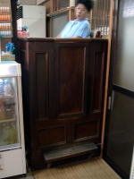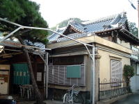 きましたねぇ・・・。いかがですこの貫禄の日本建築。 山陽電車で垂水駅の西隣「霞ヶ丘」駅から山側へ歩き、最初の信号を右折したところにある。駐車スペースも4台あり。 玄関周りの造りは天水湯に似ている。が、こちらはその他の部分の細部に渡るまで、和の装いが貫徹されている。 あっさり暖簾をくぐるのがもったいない味わい暖簾をくぐると正面に切り株を使ったオブジェあり。下駄箱の上がりがまちも全部木でできており、脱衣室へはさらに3段の木の階段を登っていくのが珍しい。お寺みたい。 下足室正面上部に、どなたかのお写真が・・・重厚な木の戸を開けると、これまたどっしりと黒光りする木の番台と、広い脱衣場。高〜い格天井に扇風機が回り、しっくい壁に木のロッカー、その上部にはさらに明り取りの格子窓に擦りガラスと、情緒満点マニア感涙の充実空間だ。 そして開け放たれた履き出しの向こうに庭があり、縁側までついている。この庭、普通の銭湯の庭の倍はあるぞ。いやあ、よろしなぁ〜。 普通は男女の仕切り壁の上にあることが多い神棚が、ここではロッカーの上に設置されており、しかもよく手入れされている。サカキの葉も新しくてつやつや。 トイレの窓まで和の味わい。レトロ保存度では今のところ神戸最高だな。 ただし気になるのは、ある人物のポスターや新聞切り抜きなどがやたらベタベタと貼ってあること。玄関先の暖簾の両脇にもデカデカと看板が出ているし、下足室の正面上部には額縁入りの近影が飾られている(上の写真)。 どうやら地元の有力者のようで、政治活動などもなさっておられるらしいが、もしかしてこの銭湯のオーナーでもあらせられるのかもしれない。そういや天水湯にも・・・。 せっかくの伝統建築の静かなる雰囲気が、このポスターベタベタで大きく損なわれているのがなんとも残念。 気を取り直して浴室へ。 湯船は中央に大きな主浴槽と、それと角部分でつながって奥の隅にサブ浴槽、というシンプルな構成。主浴槽は3分の1ほど浅くなっていて、浅い部分と深い部分に仕切りがない。深い部分には天水湯と同じ仕組みのユルいジェット水流。 湯はやや熱めの42〜43度くらい、おぅ僕のベスト湯温じゃないですか。いやぁ湯船も大きいし、これは気持ちエエ〜。 奥のサブ浴槽も、主浴槽とつながって湯がイケイケになってるので同じ湯温。でありながら浅いわけでも電気風呂なわけでもない。浴槽が2つある意味があまりないな。 見上げると、奥の壁の上部に、女湯とブチ抜きでアルプス風景のモザイクタイル絵がある。 タイル貼りの床には排水溝が刻まれておらず、床面を低いほうへ流れて排水口へ吸い込まれていくスタイル。 震災の影響か、タイルがあちこち割れて白パテ補強してある感じも、天水湯に似ている。水風呂はないが、カランの水がけっこう冷たかったので、それをかぶってもなかなか気持ちよろしかった。 あがりは、半裸で縁側に出て庭を眺めながら、腰に片手を当ててジョアを飲む。シャイコーです。 (2003.10.10) |