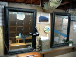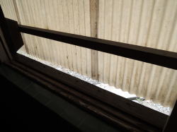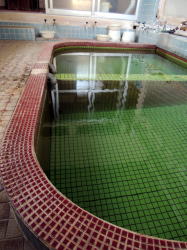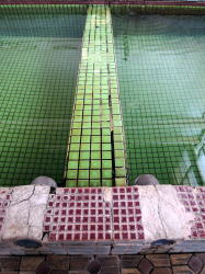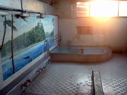 き〜み〜が〜あ〜ゆ〜う〜は〜・・・ しなの鉄道屋代駅で下車して北へ10分弱歩いたところにある。けっこう交通量が多い道路に面しているが、銭湯バカでもなければこれが銭湯だとは気づかないだろう。暖簾も出てないし。 でも門の上に張り出した松の枝がかっこいい。 ![]() (左)煙突があるから気づく (右)よく見たら入口が二つあるし ![]() (左)古い看板もかかっているし (右)やっぱり銭湯だ き〜み〜が〜あ〜ゆ〜う〜は〜・・・ ひっそりとしている。激渋のすりガラス戸を開けると、狭いタタキに棚だけの木の靴棚があり、番台には苔むしたバーサマがお座りになっている。 湯銭を払おうとしたら・・・200円だと!? き〜み〜が〜あ〜ゆ〜う〜は〜・・・ 脱衣所も狭く、新建材でチープに改装されている。それにしてもこの脱衣所、ロッカーのほかはなんもない。椅子もない。さっさと脱いで着るだけ。 き〜み〜が〜あ〜ゆ〜う〜は〜・・・ 浴室もこじんまりしている。他客は誰もいない。 床は不揃いの小石型タイルだが、あちこちハゲていて、白パテやセメントで補修されている。 湯舟は男女壁に接して深浅一つ。だが深いほうもあまり深くない。湯はやたらと熱く、さすがの俺もうめて入った。 湯舟の内側もタイルが剥げ、さらに補修のセメントまでハゲている状態。その粉で、底は少しざらついている。 き〜み〜が〜あ〜ゆ〜う〜は〜・・・ 男女壁にモザイクタイル壁画がある。定番のアルプス湖水風景、白樺&白鳥。周囲のボロさの中、この壁画だけがくすみも剥げもなく、燦然と輝いている。 その下にカランが並んでいる。シャワーはない。水はよく出るが、湯はぬるいのがチョロチョロ出るだけで、あまり役に立たない。 桶に湯をくんで床に置いたら、前の溝をなにかが流れてゆく。よく見たら薄いセメントのカケラだ。桶を置いた拍子に剥がれたらしい・・・。 き〜み〜が〜あ〜ゆ〜う〜は〜・・・ 千代に八千代に・・・とはいかないだろう、たぶん。 それでも女湯からはバアサマたちがにぎやかに語らう声が聞こえてくる。商売度外視の200円といい、この熱い湯を楽しみにしているお年寄りのためだけに湯を沸かし続けておられるのだと思われる。 これもまた日本の古い銭湯の姿だ。泣ける。 なんとか体を洗い、熱い湯に浸かりながら天井を見上げた。菱形の、ちょっと変わった湯気抜きが開いている。 壁上部から天井にかけてコンクリ打ちっぱなしのモダンな造り。だがそれが、くすんだ緑色に変色している。 コケが生えているのだ全体的に。これぞまさしく。 こぉ〜けぇ〜のぉ〜〜〜む〜う〜す〜う〜ま〜あ〜あ〜で〜〜 (2007.11.8) さて帰ろう(入口の戸を内側から) |