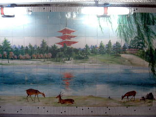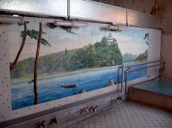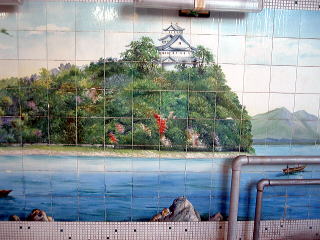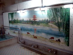 小諸駅から南東へ、約700mほどの旧市街。狭い通りの角に、さりげなくこいつが現れる。 破風の玄関小屋根の下で、暖簾が揺れている。クギヅケ棒立ち金縛り。止まらない涙止まらない。 ![]() (左)問答無用のたたずまい (右)何の印か知らねども 澄み切った空にいさぎよく ![]() (左)この形たぶんサザエさん (右)金色に屋号輝きて 深呼吸そして戸を開ける。狭いタタキに古番台。 若手の女将がほがらかに迎えてくれる。外観通りの郷愁空間だ。 ![]() (左)天井重厚こげ茶色 (右)鏡に映る脱衣箱 服を脱いで丸籠へ放り込む。いにしえより年月を刻んだ重厚なる歴史的建造物に初めて足を踏み入れて、あっという間にスッポンポンのフルチン体操。この目まいを覚えるような異次元感がたまらない。 と、浴室に入った瞬間、のけぞった体のけぞった。 夕陽輝く聖空間、その男女壁に視線が金縛り状態となる。タタタタタタタタタタ、タイル絵がそこに一面に・・・止まりかけ心臓止まりかけ。 ![]() (左)光よ・・・銭湯よ・・・ (右)小諸なる古城のほとり・・・ 緻密、見事、美品静寂の浴室に俺一人の貸切だ。落ち着けて心落ち着けて。 とりあえず湯に浸かろう。湯舟は深浅が一つだけで、フチに渋い丸タイルが使われている。だが内側は白セメント塗りで、タイルは貼られていない。これは珍しや。 例によって登山のあとなだけに、熱めのお湯が実にナイス。湯の感触が染みわたり、疲れが溶けてゆくさまが感動的だ。 トタン張りの天井と四角い湯気抜きを見上げながら、深い深い溜息ひとつ。 洗い場にシャワーはなくカランのみ。ここにシャワーなんか設置しようとしたら、絵に穴をあけることになる。だから当然なくてよし。 上がっておかみさんに聞くと、男湯の絵はどこの城かわからないと言う。 「長良川に似てると言った人がいますけど。女湯は奈良公園なんですよ」 な、奈良公園? 信州小諸で何を思って奈良公園!? 誰も入っておられないとのことで、見せていただいた。 禁断の女湯 かわいい、美しい奈良公園そのままではないが、モチーフとしてはまさしく奈良公園だろう。こっちのほうがカラフルで明るいイメージだ。 数年前に若いカメラマンがこのタイル絵を撮影に来たそうだ。 おかみさんによると、この建物は大正3年ごろのものらしい。玄関部分は雨漏りがするという。 「毎年明けるたびに『今年はもうやめよう』と思いながらまだ続けている、という状態です」 古い城下町・小諸に残った、たった1軒の古銭湯。そこにこんなタイル絵が息づいている。この素晴らしい事実にめぐり会えた喜びを、幻のコモロオオトカゲに捧げたい。(2007.11.07) いつまでも嗚呼いつまでも |