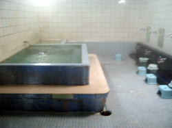 JR高田駅から南へ800mほど、近鉄南大阪線高田市駅からなら北東へ500mくらい。国道166号に面している。 屋号に恥じぬ重厚な外観。暖簾をくぐると下足室、木の下駄箱は木札を抜くと上に鍵が上がる旧式のもの。 戸を開けると・・・おいおい、番台が低くて女湯の脱衣場が丸見えでっせ。だが番台のおばちゃんは気にもせずに、高そうな液晶テレビを見ている。 脱衣場にはデデーンと木のロッカー、しかも明るい色のヒノキ一枚板に漢数字が掘り込まれている。天井は格子状で、番台や男女仕切り壁などの木も渋い。 浴室には中央やや右寄りにタイル張りの深浅浴槽。奥には「気泡風呂」と書かれた副浴槽があるが気泡は出ていない。 浴槽フチには珍しく黒いタイルが使われているが、これがひび割れたりしていて、かなりキてる感じ。湯は熱め、44度くらいか。 正面の壁上部に男女ぶち抜きで描かれているモザイクタイル絵は、桜の季節の奈良公園かな。なかなかよろしい。 でも経営のモチベーションはやや低そうな・・・大丈夫かな? (2004.4.10) ジス・イズ・ジャペーン |