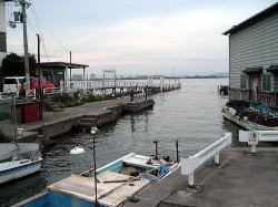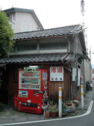近江八景・浮御堂の近く。JR湖西線の堅田駅から歩いたら20分くらいかかる。 堅田港のすぐそばの横丁にたたずむ、うっかり見逃してしまいそうな小さな風呂屋だ。正面に木が豪快に茂っており、その奥で遠慮がちに暖簾が揺れている。 しかしこの木、よく見ると玄関前の岩にこびりつくように生えていて、しかも幹にはツタがびっしりとからまっており、ちょっと不思議な感じになっている。 ![]() (左)木が邪魔で正面から暖簾はほとんど見えない (右)そのかわり看板あり 裏側から。道の正面に琵琶湖が見えるうなぎの寝床のように間口が狭いプチ銭湯だ。 暖簾をくぐると、タタキ部分と脱衣所の一部を改装した下足室兼フロントになっており、おばちゃんがテレビを見ている。下駄箱はフタなし棚だが、その横に鍵つきのスチール小ロッカーがある。貴重品入れか。 小さな脱衣所はほとんどベニヤ張りの、チープな田舎銭湯そのもの。フロントに改装しながら内部が手つかずなのは珍しい。 木製ロッカーがいくつかあるが鍵はなく、あとは棚にプラ籠が並んでいる。壁際に年季の入った木のベンチが一つ。 浴室は一般的な京都~大津の古いスタイル、カマボコ天井に大きな湯気ヌキが空いている。 湯舟は仕切り壁に接してタイル張りの深浅主浴槽。温度表示43度、気泡つき。奥にジェット2連浴槽もある。まあ、どうってことないっちゃあ、どうってことない。 でも、この日もよく歩いたから熱めの湯がマコトに気持ちええ。 カランは温度調節が弱いなあ。しばらく出してやっと湯が出たと思ったら、しばらくするとまたぬるくなってやがる。シャワーなんかほとんど水のままだ。でも、その状況でうれしそうに「ニヤッ」とする俺。完全変態。 2ヵ所の壁上部にモザイクタイル絵がある。奥壁は琵琶湖大橋、手前壁は滝の絵だ。 脱衣所には飲み物もなし。設備メンテもテキトーな無造作系だが、お客はそこそこ回転していた。 フロント前のテレビでは「笑点」をやっている。のどかな日曜日の夕方。湯上がりは浮御堂までぶらぶら湖岸を散歩して、のほほ~んと脱力し切ろう。 堅田駅から循環バス(160円)に乗ったらすぐ。(2005.5.8) 港湯から1分の堅田港 |