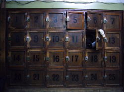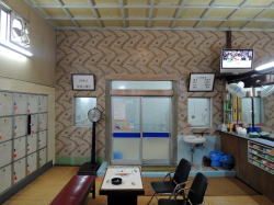いにしえ度において最強クラスの銭湯だ。 山陽電車の東二見駅から南へ数分歩くと漁港に出る。界隈はミニならまち的な風情あふれる、鄙びた街並み。 港から北東を見ると、レンガ造りのどっしりした煙突が見える。それを目指して狭い路地をコチョコチョっと行くと、歴史を感じさせる風格ある建物に、人知れず暖簾がそっとかかっている。 (左)南側から (右)東側から暖簾をくぐると、普通は下駄箱があるスペースには古風な土間が広がっているだけで何もない。この段階ですでに何やら強烈なタイムスリップ空間が始まっている。まるで時代劇のセットみたい・・・。 暖簾のむこうにもひとつ暖簾戸を開けてもう一度暖簾をくぐると、番台の横に木の下足棚がある。下駄箱はない。番台には意外にも40代女性が座っている(帰りしなには小学生が座っていた)。 靴を脱いで脱衣場に入るや、めまいにも似た「ここはどこ? ワタシは誰?」感に襲われる。 ![]() 板張りの床、格天井、木のロッカーに囲まれた、古びた小空間。 ロッカーの鍵は3つくらいだけで、ゴムもなし。盗難などありえない、地元民オンリーの銭湯だ。機能していないマッサージ器周辺にカタログ雑誌などが積んであり、生活感が濃厚に漂う。 浴室も強烈にクラシックだ。床は石畳で、隙間にタイル市松張りの王道パターン。 仕切り側にカマボコ断面型の古い石造りの浴槽が1つ。周囲の腰かけ段は黒御影。湯温は41度くらいか。 先客は初老の男が一人だけで、途中から貸切状態になったが、女湯のほうからは数人のおばさんたちの賑やかな話し声がずっと聞こえていた。おばさん連中の夕方の社交場になっているようだ。 奥の壁を見ると、12枚のタイルを使ったタイル絵がある。富士山ではなく、湖南省あたりを思わせるなだらかな山と川の風景。いいねえ。 と、ここまではよかったのだが・・・。 奥に、使われていない扇形の浴槽がある。地方の古い銭湯にありがちだが、ここはカラのその浴槽に使用済みのカミソリやシャンプーの空き箱などが投げ込まれ、ゴミ箱と化していた。しかも、しばらく片づけていない様子がうかがえる。 立ちシャワーの鏡の前の段には、はがれた床のタイルが無造作に積み上げられ、これも長らくそのままの様子。 カランは4つ、シャワーもついているが水しか出なかった。仕方がないので湯船のフチに座って湯をかい出して体を洗う。 もはや客商売としてギリギリラインのようにも思える。いや、この状態でなお営業を続けられていることが奇跡であると言えるかもしれない。 常連客のために、経営者が最低限のモチベーションでかろうじて維持していることを感じさせる。 しかし、この文化遺産的な建物や石造りの浴室は貴重なものだ。 東二見には歴史的景観建築物が多く残っているので、それらとともに何らかのかたちで存続させられないものだろうか。(03.12.18) 帰るとき、内側から見た暖簾付近の風情 |