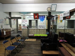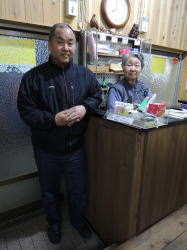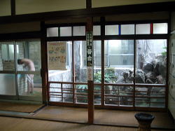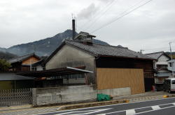 駅から一つ目の信号を左(北)へ徒歩数分。突き当たりの右手に煙突が見える。でも建物は道路に面しているのに玄関はナナメ後ろを向いているぞ。ハニカミすぎではないか。 道路拡幅前は家々が建て込む狭い路地の中にあったのかな。 道路から入り込んだ路地に玄関しかしまあここも尾鷲の他2軒に負けず劣らず渋い面構えだ。ただならぬオーラを感じる。 戸を開けると木の番台におかみさんがいて、「300万円」とおっしゃる。「はい、300億円」と言って300円を渡すと、たいそう喜んでくださった。 ![]() (左)番台周辺、男女を分かつカーテンを吊るじゃばらが素敵 (右)タタキと上がりがまち そこそこ広い脱衣場はクラシック一色。板張りが素足に心地よい。格天井の3枚羽プロペラはぶっ壊れたのか紙でくるまれている。 これくらいのレトロ加減は尾鷲標準だが、都会にあったらチャンピオンクラスよね。 ![]() (左)脱衣箱 (右)格天井 ガラスに屋号あり裸になって浴室へ進むと、奥にタイル張りの2槽が並ぶスタイル。 どちらも深くて、左は43度くらいでジェット1本あり。右はかなり熱くて45〜46度くらいはありそう。横に湯もみ棒があって、それで混ぜたら底の湯はさほどでもなかったようで、1度は下がった感じだ。 この日は朝から尾鷲には珍しく雪が積もって、その中を歩き回ったから全身ヒエヒエ。だから熱い湯がうれしいねぇ。 アツアツに湯立って、カランの冷水をかぶる。この反復で寒さを感じないカダラになるんだよ。 上がって聞くと、おかみさんがここへ来た40年前には浴室中央に楕円形の湯船があり、シャワー設備もなかったそうだ。そのため湯船の周囲で頭を洗う人が多く、湯船にどうしても泡や髪の毛が入る。 「それが嫌で今みたいに改装したんよ」 大阪じゃ今でも湯船まわりで頭を洗うけど・・・そのための座り段までおます。 清く熱き尾鷲の湯に乾杯。(2011.2.11) 天狗倉山をバックに煙を吐く※「レトロ銭湯へようこそ関西版」に掲載されました。 (本書が買える銭湯一覧) |