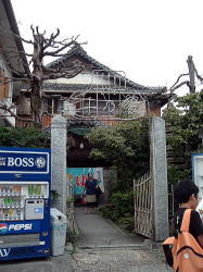 伊勢湾沿いの鄙びた漁村、白塚。その静かな迷路状路地を、巨大戦車のごとき原野ラリー車ランクルが地響きを立てて駆けまわる。 「いこに! 三重県の銭湯」の桶太郎さんが、白塚の小さな銭湯へ俺を案内してくださった。あたかも出刃包丁で髭を剃るがごとき風呂通いと言わざるを得ない。 やがて古い街道沿いの空き地にバカデカ車がジャリっと停まり、タオルと石鹸を持って、屈曲した路地を少し歩いた。 電車の場合は近鉄の高田本山という駅が近そうだが、1.3kmほどある。 ![]() (左)クランク状の曲がり角に (右)正面にシカのモザイク画 密集集落に忽然と現れる1軒の古い銭湯。クリーム色の化粧板が貼られた正面および屋号看板は真新しいが、瓦屋根の本体は相当古そうだ。 玄関部分はナナメに掘り込まれている。九州あたりで見かけるスタイルだ。暖簾はないが、ナナメの男女入口の間にあるシカのモザイク画が、銭湯であることを示している。 入るとタタキに番台、そして小ぢんまりとした脱衣場。特別なものは何もなく、ついでに平成もクソもない。 ![]() (左)エエ味出してるおかみさん (右)脱衣場、無音 ![]() (左)ベニヤ補修の脱衣箱 (右)この籠は貴重! 見たことのない丸籠がある。しかも造りが見事だ。これは貴重品に違いない。 その籠に脱いだ服を放り込んで、風呂場へと進む。 じつはこの風呂場は、ニッポン銭湯王国展に出品された松原豊氏の写真で知っていた。 だが桃太郎モザイク画をはじめとする実物のレトロっぷりをこの目で見ると、またなんともいえぬ深い感慨に包まれる。 ![]() (左)桃太郎のモザイクタイル画 (右)崩壊しかかっているカランまわり 奥壁には山と湖を描いたモザイク画もある。 それにしても相当な年季の入りようだ。小さな写真ではわかりにくいが、桃太郎の愉快なモザイクアートもさることながら、有り合わせタイルで強引に補修された床面や、変色した湯船タイルなどのインパクトに唸らされる。 特にカラン周辺はひび割れて崩壊の一歩手前という状態だ。 だが湯船にはアツアツの清澄なお湯がなみなみと沸かされており、その極楽感・贅沢感と、満身創痍の浴室とのギャップに目まいを覚えそうだ。 やっぱり風呂は実際にお湯に浸からないと、その価値はわからんのよね。 はげはげ天井の湯気抜きちなみに白塚にはもう1軒、強烈な古銭湯がある。 全国的にこの手の超レトロ系は絶滅寸前だが、それが2軒残っているのは、松阪の「猟師の奇跡」と並ぶ「白塚の奇跡」であるといえるだろう。 (2013.10.27) ※「レトロ銭湯へようこそ関西版」に掲載されました。 (本書が買える銭湯一覧) |