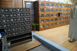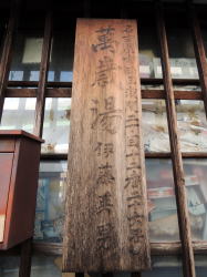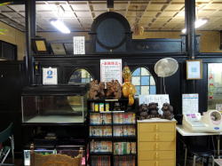地下鉄浅間駅から5分もかからない裏通り1筋目、こんな都会の真ん中にこんなイニシエ銭湯あり。 まことにもって古めかしい町家づくり、3階建ての高さがあるが銭湯は1階天井が高いからこれで2階建てなのよね。 玄関部分は引き戸が間口ラインからわずかに斜めに角度をつけて取り付けられている。が、それにしても正面足元部分のガムテ補修が痛々しい。 ![]() (左)風情万点の面持ちだが (右)ガムテ強烈 歴史を物語る看板中へ入ると狭いタタキに番台があって、おかみさんが座っている。タタキは名古屋式に細かい緑色タイルで縁どられ、脇にはやはり名古屋式の金属フタ下駄箱。 脱衣場はうなぎの寝床的に奥に細長く、外観同様いにしえ構造そのままだ。 しかしもっとも目に付くのは、狹い脱衣場の4分の1を占領して積み上げられているダンボール箱の山。販売用の飲み物の箱みたいだけど、これをのけたらスッキリするのに残念!(番台背後に無造作に詰め込まれている古い石鹸箱類も)。 脱衣場と浴室の間は名古屋銭湯らしく接続空間になっていて流しがあるが、この上部に山と湖のモザイクタイル画がある。 浴室も細長く奥へと伸びている。 まず目に飛び込んでくるのは奥壁一面に描かれたモザイク画だ。山と湖の絵柄は多いが、ここは平原に湖が広がる風景で、珍しくも素晴らしい。湖には白鳥が浮いている。大昔の濃尾平野はこんなのびやかな風景だったのかもなー。 湯船は男女隔壁に沿って深・浅・デンキと並んでいる。 デンキの半分は岩場的に飾られ、そこに焼き物の鯉が置かれている。が、この鯉でけー! 80cmはある大物だ。しかもリアル。いまだかつて銭湯でこれほど大物の鯉と遭遇したことはない。日本一の鯉銭湯かもしれん。 お湯はややぬる目だが、たっぷりナミナミ。 鯉の下の方からジェットが1本出ており、それを腰に当てながら鯉の頭をよしよししてやろう。 窓側のカラン列と湯船の間の床に排水溝が1本掘られ、真鍮の蓋がされているのも名古屋ならではの味わいだ。 上がっておやじさんに聞くと、空襲を生き延びた戦前の建物らしい。あちこちガタがきてガムテも大忙しだが、めげずに営業を続けておられる。 名古屋も古い銭湯が激減しており、こういった銭湯の貴重性は増すばかり。末永く存続されることを願わずにはおれないが、とりあえずはダンボール箱と石鹸箱をなんとか…。 (2011年7月) |