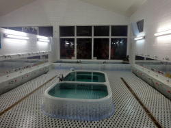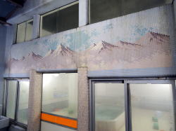 地下鉄の中村日赤駅から南東に徒歩5分ほど。病院裏手の住宅地の中に煙突がそびえている。 近寄ると瓦屋根の年季の入った建物だが、正面にまわるとタダならぬケハイが漂う。木造玄関と外側のコンクリアーチがなんとも言えぬゲージツ状態で調和しているではないか。ふいに中央アジアのシルクロードを想起させられた。 角の小さな赤い看板が目印しかしこの前の道といい横の道といい、狭いのに交通量が多いなぁ。抜け道になってるみたいだが、落ち着いて鑑賞してられん。 ともかくアーチをくぐると左右にナナメ入口、そこを開けるとタタキに番台がある。 下駄箱は東海地方特有の穴あき金属フタ、あがりがまちは桜湯に似た感じで濃緑の豆タイルがびっしり貼られている。 脱衣所は新建材で改装済みだが、浴室との間の流しスペースがかなり広い。そしてここにも豆タイルが貼られている。 浴室はさほど広くはない。コンクリ天井にはなぜか湯気抜きが存在しない。床にはピンク色の小さなタイルが貼られている。 湯舟は手前に広めの浅風呂、その奥に一人サイズの気泡とデンキが並び、最奥の隅に2人サイズくらいの深風呂がある。 そして最大の見所は、奥壁に男女ぶち抜きで一面に描かれた雄大なモザイクタイル画だ。雪をかぶったどっしりとした山の絵だが、どういうわけか山頂部分だけ白タイルで消されている。一番いいところなのに・・・! カランまわりにも曲面に豆タイルがびっしり貼られており、タイル教信者には嬉しいところ。 夕方6時前後、他客はお年寄りが5〜6人。湯舟が小さいのがちょい残念だが、使い勝手はよく、活気を感じた。(2007.10.2) |