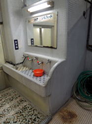 名鉄常滑線道徳駅から西へ徒歩10分ほど、交差点の角にイニシエ系銭湯あり。飾り気のない、寺院の宿坊を思わせるようなすっきりと潔い外観がじつにエエ。 ![]() (左)角に立地 (右)目隠しの板塀の後ろ、暖簾の裾が結ばれている 暖簾をくぐって戸を開けると、タタキに番台があり、おやじが座っている。下駄箱は東海式(スケスケ金属ふた手前引き上げ)。 そして脱衣所の高い天井もまたよし。と、ここまではまぎれもなく正調古典派の銭湯空間だ。 でもその他の内装は意外にも綺麗に改装されていて、古いものはあまり残っていない。ロッカーもアルミ製。 浴室手前の流しスペースに、立ちシャワーがあるのが珍しい。 浴室も全面改装で現役バリバリだ。中央に深い主浴槽、奥に浅風呂(気泡+ジェット)とデンキ風呂(薬湯)。 カランは自動調温式の蛇口1個型。 奥壁に熱帯魚のモザイク画がある。 上がりは飲み物販売あり。 パンツ一丁で体をさましながら見上げる、玄関上部の明かり窓あたりのイニシエ風情がじつによい。 ひとつだけ、脱衣所や浴室に掛け時計が見当たらず、風呂に入りながら時間がわからないのはマイナス点だ。 内部は改装されてイニシエ好きにはややもの足りない感じもするが、使い勝手の良い、清潔感のあるいい銭湯だ。よくはやっていた。 (2008.7.4) |