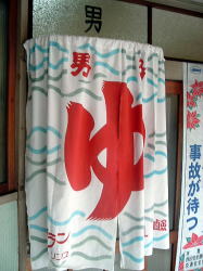 スーパー銭湯全盛の名古屋で、レトロ系として有名なのがここ。 名古屋駅太閤口から始まる「駅西銀座」を終点まで歩き、さらにまっすぐ行くと、昔の赤線だったディープなエリアに出る。その南北のメインストリート「大門(おおもん)通り」を南下して、大門ゲートの1本手前の細い路地を入ると、目指す「廓(くるわ)湯」が現れる。 (左)大門通り (右)廓湯玄関 さすがは「廓湯」を名乗るだけあって、威風堂々たる立派な門構え。なにせ「廓」です。男と女のアレコレが渦巻く怒涛の歴史を刻んできたに違いない。 暖簾をくぐると狭いスペースで左右に男女別れ、戸を開けるとタタキにすぐ番台がある古いスタイル。 広めの脱衣場はイニシエ色の濃い格天井が高〜いところにあり、これぞ銭湯ともいうべき空間が広がっている。ロッカーは木で、中央にすりガラスがはまっているタイプ。 伝統的な銭湯だけが持つ、温かいようなひんやりしたような独特の空気にじわーっとひたることができる。 浴室も広々していて、奥行きより横幅が広いのが珍しい。だが適度に改装されていて外観ほどの古さはなく、清潔感がある。 まず目に入るのは奥の壁の巨大モザイクタイル絵。木陰で憩う裸婦2人の図だが、これがちょっと……情緒イマイチか……。 中央に主浴槽と電気風呂、それにつながるかたちで隅に岩をあしらった気泡風呂があり、のんびりできる。でも3つの浴槽の湯温は同じで、しかもちょっとぬるかったのが惜しい。 気泡風呂の一角を除く4周にカランがたっぷりあって、使い勝手はいい感じ。(2003.11.28) |