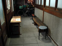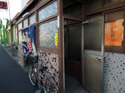 地下鉄鶴舞線の荒畑駅から10分くらい歩いたところ。幹線道路がV字型に交わる向こうにあるあれは、お風呂屋さんや〜おまへんか〜っと。 近くへ寄ると、おおー、なかなかの風情ぢやございませんか。 ![]() (左)両横から入る (右)かわいいモザイクタイル 玉石タイル、窓の木枠、模様ガラス・・・正面の暖簾はかかっているだけで、入口は両脇から回り込むかたち。 外から脱衣場が見えないようにと工夫された玄関だが、ここに使われている素材のやつらが心の郷愁領域のこそばゆいところをツンツン突いてきよるがな。 中に入ると番台におかみさんがおられるが、なんともじつに感じの良いお方だ。 脱衣場は昔ながらの木造空間で、高い天井に3枚羽プロペラがある。 古いまま使い込まれてなお日々手入れを怠らず、大事に清潔に管理されていることがすぐにわかる。良い。じつにひじょーにまったくもって良い。 浴室入口周辺の淡い青緑パステル系のタイルも美しくて良い。 白タイルの浴室は、真ん中に主湯がデーンと鎮座している。熱めのお湯で心地良い。 奥にデンキとジェット、これまた強力で良い。 良いね! 良いぞ! 惜しげもなく「良い」ボタン連打! おかみさんのお人柄も含めて、非の打ちどころがない。 古くて小さな銭湯だが、誰もが気持ちよく使えて心から和めるホンマ良き風呂、名古屋の宝物。 (2015年1月) |