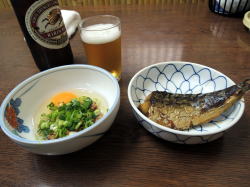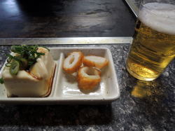 久寿川駅徒歩1分。土曜日の午後4時半という、ちょうどよく中途半端な時間帯だ。 テーブル4~6人がけ4つとカウンター3~4席あって、店内はわりときれい。壁は腰高まで竹材が張られている。 店のおっちゃん、おばちゃんと常連客二人がテレビで阪神広島戦を見ている。おばちゃんがいちばん盛り上がっている。 右端おばちゃんの視線の先にテレビ壁に貼られたメニューは麺類・丼物その他400~500円ぐらい。 おかずケースは常温と冷蔵の二つ、それぞれ充実している。サラダが豪華だが、鯖塩と納豆玉子つきをチョイス。それと大瓶。 さらに、野球の合間に中華そば450円を注文。チャーシューではなく焼いた豚肉とカマボコが載っている。 味は特段どうということもないが、このフツーの安定こそが大衆食堂だ。 ![]() (左)まずはオカズでビール (右)仕上げに中華そば 一品メニューはどれも一般的食堂価格より少しずつ安いかも。合計1130円だった。鯖200、中華そば450、納豆100、大瓶…380? えらい安いな。もしかしておっちゃん計算間違えてるんかも…。(2016年6月) |