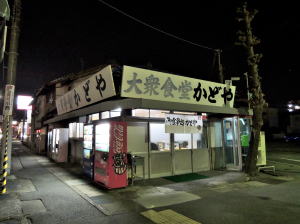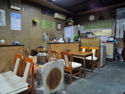 最寄駅は姫新線の播磨高岡だが、姫路駅から頻繁にバス便があるし、1.5kmやから散歩しながら行くもよし。 国道2号線に北側からするどく道路が交わる、まさに角地にある。一目見て、時間が40~50年は止まっていることがわかる。 ![]() (左)正面、のぼり立つオーラ (右)小上がりの座敷あり 店に入るや、予想を裏切らない時代錯誤な情景が展開する。空気の沈滞っぷりが素晴らしい。 6人掛けの大きなテーブルが6つほどと、小上がりの座敷。角地らしく、奥の厨房は三角形にゆがんでいるようだ。 厨房との間のカウンターにおかずケースが乗っている。その右におでん(関東煮)器があり、常連客はみな勝手に好きなのを取って、姫路らしく生姜醤油をかけて食べる。 テレビではNHK大河ドラマがかかっているが誰も見ていない。 店主のおやじさんは座り込んで常連客と話し込んでいるし、エプロン姿のばあさん店員は盆を落として大きな音を立て、「手ぇがしびれてきてんねん頭もしびれてるけどなウキャキャキャキャ!」と愛嬌いっぱいに笑ってるし、常連客のタクシー運転手は誰も聞いてないのにデカイ声で人生論をぶっている。 もはや舞台である。新喜劇の。 ここでは誰もが俳優だ。一見客も観客になる必要はない。おやじどもの話をさえぎって注文すれば、店主が機敏に丁寧に対応してくれる。 意外にも、上品なご婦人が一人めしを食いに来たりもする。 ![]() (左)関東煮すじ150円、ひろうず120円、あとみな100円 (右)とん汁170円 丼物や麺類はほぼ400~500円台。ビール大瓶550円。一品ものも「生卵60円」「味のり70円」から「うなぎ600円」まであるので、居酒屋使いもよし。 でもやっぱり関東煮をつつきながらチビチビやるのが一番しっくりくるだろう。 一味は「栗甘露煮」の瓶に入っているうるさいタクシー運転手が帰ってすぐに、厨房の奥から土建屋コンビが入ってきた。裏口があるようだ。 新たな役者登場で舞台はさらに盛り上がり、夜は更けてゆく。23時までやっている。 (2015年2月) |