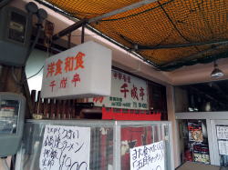 ふしぎな店だ。 まず場所が謎。加古川線の神野駅から徒歩数分だが、よくわからない。但陽信金の角を左折し、次の角をもう一度左折したら、死にかけの神野市場が現れる。 何もないだろうと思われる廃墟状態のL字棟の一番奥に・・・。 ![]() (左)蝶つがい部分になんか見える (右)何屋さん? 勇気を出して近づくと、手前に「洋食・和食 千成亭」の箱看板、正面には「中華料理 千成亭」の看板と「ラーメン」の暖簾。そしておかずケースと惣菜販売ケースが表に出されている。 それらガラスケースには、「とにかくうまい鍋焼きラーメン」とか「また食べたくなる五目チャーメン」などとマジックで書かれた紙がベタベタと貼り付けられている。五目チャーメンて何やねん。「オードブル5000円より」というのもある。5000円! そして最も信じがたいことに、「営業中」の札が下がっている。やってるぞ…。 中に足を踏み入れた瞬間、「この店は通わなければ!」と直感した。 とにかく狭い。その狭い空間が、食い物と張り紙で溢れている。すごいエントロピーの高さ。 ![]() (左)テーブル2つとL字カウンターのみ (右)カウンター上はおかずだらけ カウンター上のおかずは全部うまそうで、片っ端から食いたくなる。店のおばちゃんが一人で作っているようだ。 壁に貼られたメニュー群も気になってしょうがない。「皮くじら入り粕汁250円」「和牛を使ったかつめし800円」「海鮮汐っぺラーメン750円」「キムチ焼きそば700円」・・・くそう~、「汐っぺ」のネーミングセンスに嫉妬するほどだ。定食も700~800円台でいろいろある。 しかしここはやはり五目チャーメンを頼まなければな~。 これが五目チャーメン680円それはあんかけ揚げ麺だった。エビや豚肉、イカの足などが入っている。なかなかいけるし、汗をかくくらい体が温もった。 惣菜屋・弁当屋としても、一人暮らしのお年寄りなどに重宝されているようだ。 カウンターのお惣菜で酒を飲むのも非常によさげだが、夜は営業してないらしい。 「だって真っ暗になって怖いから、誰も来られへん」って、そやろな。 とにかく、多種多様な料理を狭い厨房でガンガン作るおばちゃん。只者ではなさそうだ。 (2015年2月) |