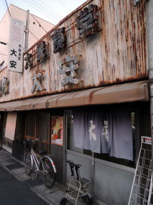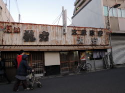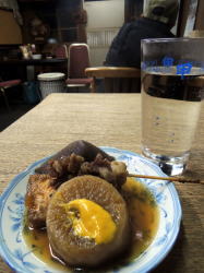 山陽電車の飾磨駅を出てすぐ左。駅から30秒の好立地に、見た目ド迫力の食堂がある。 横長の間口を端から端まで覆い尽くす、サビの浮いた大文字看板。惚れ惚れする。 ![]() (左)左のビルの横が飾磨駅 (右)左側には「酒は龍力」と書かれている 中に入ると、テーブル3つにカウンター3席ほど。ディープなオーラが色濃く漂っている。カウンター内のおでん類も色濃く煮詰まっている。 おやじ客とおばさん客が一人ずついるが、店の人はいない。メニューらしきものも一切なし。 「すんませーん」と叫ぶと、ストーブの前に座っていたおやじ客が立って厨房奥の店主自宅と思われる部分に入っていき、客が来たことを告げに行ってくれた。 やがて、杖をついたおばあさんがゆっくりと出てきた。もはやグリム童話の世界。 「おでんくらいしかないけど~」とおっしゃるので、ダイコンとスジとコンニャク、それに焼酎のお湯割りをもらう。 中央はおやじ客、左はおばちゃん客おばあさんの足元がおぼつかないので、おでんは自分で厨房入口までもらいに行った。 横のおかずケースを見ると、イワシ煮つけととゲソ煮つけが一つずつあったので、それももらう。 ![]() (左)おでんと焼酎 (右)イワシとゲソ 駅前の異空間で、お湯割りをチビチビやりながら過ごす意味不明なひととき。たまらん。妙な興奮が静かに満ちてきて、最高感に包まれる。 どうやらおばあさんは息子さんと二人で店をしてるようだが、夜は常連客(たぶんこのときいた客+α)しか来ないので、一人で留守番をしているっぽかった。 帰りしな、自分が飲み食いしたものを台所の流しへ運んでおいた。 外観・内部ともに、もはや映画のロケも困難なほどのスーパーレトロ食堂。今度は息子さんがいる時間帯に来てみたい。 (2015年2月) |