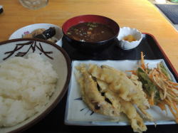 昼下がりの松阪。駅から北へ少し歩くと、道路の角に素朴な食堂があって、白い暖簾が風にはためいている。 玄関先のブラックボードを見ると、「今日の日替り、わかさぎ天ぷら650円」…食っていくか。 白い暖簾が清々しい中に入ると相客おらず、テーブル3つにカウンター3席のこぢんまりとしたスペース。そこに、白い割烹着のふくよかなお母さんがいる。 壁メニューを見ると、麺類は600~700円台とお高めだが、定食ものは700~750円と一般的。ほかに1品もの400~800円や刺身もあって、居酒屋づかいもできる。 かつ煮定食900円も気になったけど、表に書いてあった日替定食り「わかさぎのてんぷら」650円を注文。 さっそくパチパチと油のはぜるいい音が聞こえてきた。 定食の小鉢は5種類から選べる。里芋煮を選んだら6~7個たっぷり。赤だしの豚汁もうまし。 ワカサギ天にはニンジンとゴボウのかき揚げもついてるやん。 ![]() (左)店内 (右)日替り650円 帰りがけに常連らしきおばさんが来て、ビールを飲みはじめた。あー、いいねビール! お昼時さえ外せば、ゆっくり飲み食いしながらのんびりとくつろげるお店なのね。 (2015年1月) |