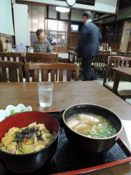 日本三大観音の一つ、津観音。その門前に広がる大門地区に、ひときわ歴史を感じさせる食堂がある。 大森屋は津市内にほかにも何店か見かける。支店なのか暖簾分けなのか知らねども、ここがその総本山であろうことは貫禄からして間違いないだろう。 外観もイニシエなら、広々した店内も古き良き昭和の風情。古い店だが重々しさはなく、誰もが気軽に入れる雰囲気がある。 テーブル9つくらいに小上がりもありお昼は、うどん類(400~600円)、丼物(600~800円)、洋食(500~800円)、定食もの(800~1000円)、その他一品ものがいろいろあるが、夜は中華そば(700円)類だけになる。だけになってからが長くて深夜0時まで。 中華そばは食堂系の清湯スープではなく、わりと本格的な濁ったやつ。コクがあってうんまいわ~。 ![]() (左)日替り定食800円、玉子丼とミニラーメンと小鉢 (右)かっこいい看板 津を代表する文化遺産的大衆食堂、値段がややお高めやけど拝観料込みと考えとこか。 (2013年10月) |