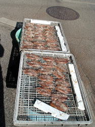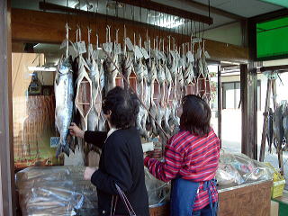 (左)こんなふうに干したのを吊るし売り (右)これが新巻鮭かな?