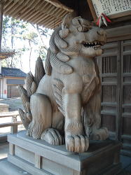 (左)放生津八幡の狛犬、ポケモン的デザイン (右)線路のかなたに聳える北アルプス