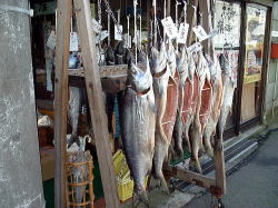 放生津のメインストリートはひなびた商店街になっており、何軒かある魚屋の軒先には鮭が豪快に並んでいる。