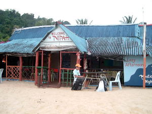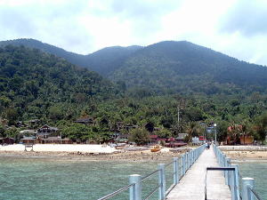 3日目◆シンガポールからティオマン島 朝6時集合のバスに間に合うよう、5時すぎに眠い目をこすりこすり起きた。 そして伍星旅遊のバス発着場まで、暗い中を1.5kmほどタッタカ歩く。朝でも熱帯はやっぱり蒸し暑く、じっとりと汗をかいた。 伍星旅遊には他の客もすでに集まっていたが、カウンターの太ったマレー系の無愛想な女は客を無視してダルそうにパソコンのキーを叩いたり電話したりしている。20分ほど待たされてやっと手続きをした。 しかし店の前の路肩にはたくさんのバスがズラッと並んでいて、メルシン行きのバスはどれなのかサッパリわからない。 そのへんの運転手に聞いて、少し離れた路上に停まっているバスを教えてもらった。俺と丘がバスの横へ行くと、あとから他の客もゾロゾロと集まってきた。中国系カップルが1組と、白人の家族連れやバックパッカーが3〜4組。日本人はいない。 バスのドア前で10分ほど待っていると運転手が来て、乗客をバス内に招き入れた。座席はソファーみたいに豪華だ。 バスはすぐに出発した。 20分かそこらで、マレーシアとの国境、コーズウェイにさしかかった。コーズウェイはシンガポール島とマレー半島の間のジョホール水道にかかる橋・・・のように見えるが、じつは海を埋めて築いた堤防らしい。 なんとシンガポールとユーラシア大陸は地続きだったのだ。 そのコーズウェイを渡るうちに、異変を感じた。なにやらバスが立ち往生して大変なことになっている。 フロントガラスを見ると、前からどんどんバスに向かってマレーシアの車がやってくる。マレーシアの車か、このバスか、どちらかが車線を逆行してるようにしか見えない。こんな光景は生まれて初めて見た。いったいどうなってるんだ? 当然のことながら大渋滞。運転手も必死のようすだが、どうにもできない。 と言いつつ悪戦苦闘の末にどうにかなったらしく、やっとこさ進んでコーズウェイを脱出した。 ちょっと走ったと思ったらバスはまた停車した。そして全員がバスを降りる。シンガポールの出国審査場だった。ここはパスポートだけで簡単に通過する。 建物を出たところにバスが待っていて、また乗り込んだ。少し走ったと思ったら、また停車して全員下車。今度はマレーシアの入国審査場だ。俺はいつものように辞書を引きながら時間をかけて審査カードに記入し、ラストで通過した。 こうして無事にマレーシアに入国した。 外で待っていたバスに三たび乗車し、今度こそメルシンへ向けて走った。 しばらく走ると、イスラム教徒の白いベールをかぶったマレー系の若い女性が俺の横へやってきて、英語で話しかけてくる。俺の今夜の宿はどこかと聞いているようだ。乗客名簿らしいファイルを持っているので、伍星旅遊と契約している現地スタッフなのかな? さすが一人25Sドル(2000円弱)もしたチケットだ・・・。 宿はティオマン島へ上陸してから適当に探そうと思っていた。だからどこも予約していないと言うと、そんな客は珍しいようで、しかも英語もつたない親子を見て、なんとかしてあげなくちゃと思ったようだ。 彼女はいったん俺の横を離れてから、しばらくしてまたやって来て、真剣な顔でメルシンに着いたらドウノコウノ・・・と言う。なにかよくわからなかったが、彼女が非常に真面目そうで、美人で、また控えめで静かな語り口調もよかったので信用してもよかろうと思い、とりあえず「OK, I see.」と言っておいた。 マレーシアにはおもに3種類の人々が住んでいる。人口の1/4を占め経済を牛耳る中国系は自信満々、7%だが商売上手のインド系(ほとんどドラビダ系)は人懐っこいがどこか油断ならない感じ、そして多数派のマレー系は控えめではにかみ屋。そんな性格だからマレー系は中国系とインド系より社会的劣位に立たされている。 でも日本人としてはたぶんマレー系と話すのが一番ラクだろう。ただし彼らはイスラムなので、あくまで表面的な関係においては、だが。 バスの車窓は、延々と続くパームヤシの単調な森だ。これが日本のヤシノミ洗剤なんかになるのだろうか。ジャングルは徹底的に切り開かれ、ほとんど残っていないので景色はすぐに見飽きてしまう。 1回のトイレ休憩を挟み、シンガポールを出てから5時間ほどでメルシンに着いた。 バスを降りると、さっきの若いマレー女性に、別のマレー女性(こんどは太っちょのおばさん)を紹介された。バトンタッチで引き継いだそのおばさんは、俺と丘を乗船場のすぐ近くにある小さな旅行会社のオフィスに連れて行った。 メルシンの乗船場、真新しくて立派このおばさんもさっきの若い女性同様、日本人的な気配りをする、感じのいい人物だった。 おばさんはティオマン島の各地を紹介するファイルを見せ、ティオマン島のどこへ行きたいのかと聞く。俺は「ムクッという村に行きたい」と言った。そこがイヤーズ・オブ・ドラゴンにいちばん近いからだ。 しかしおばさんは、「ムクッはストーンビー