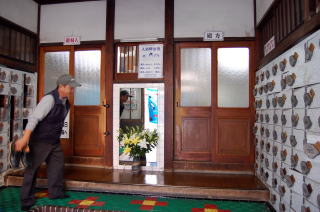 2010.10.31(日)・・・ふろいこか〜まであと8日! まいはーい。松本康治です。 すいませぬ。カウントダウンといいながら昨日さっそく休んでしまいました。むはは。 さて、いきなりカツオのたたきの話で始めてしまったこのカウントダウン日記ですが、今回のふろいこか〜2010大阪の最大の魅力は何といっても、会場となる寿温泉という大阪を代表する偉大なるレトロ銭湯を抜きには語れません。 寿温泉さんはJR環状線&地下鉄中央線の弁天町駅から徒歩7〜8分(→地図)。 着いたらまず、玄関上部の屋号をお見逃しなく。モザイクタイルで描かれています。 ![]() 大阪にはこのモザイク屋号の銭湯がいくつか残っていますが、こういう面倒な仕事を丁寧にしてくれる職人さんは今でもどこかにおられるのでしょうか。 とにかく貴重なものだと思われます。 暖簾をくぐると、広々とした玄関スペース。ここも落ち着いた昭和の香りが漂います。 ![]() ふろいこか〜当日は、ここで靴を脱いで下駄箱に入れて札を抜いて各自お持ちくださいね。 そしてイベントの入り口は左側(女湯側)の引き戸です。 この入口の戸に手をかけた瞬間、ここがポイントです! 男湯側の戸を内側から見たところいかがですか、この磨耗。 人間の指先のヒフによるわずかな摩擦だけで、ここまで磨かれてしまうとは。 みんながお風呂に入りたくて、ここに手をかけて戸を開けてきました。 寿温泉とともに歩んできた弁天町の人々の歴史がここに刻まれているのです。 さて、では番台でオカネを・・・っと、この番台がまたアンタ! ![]() いかがでしょう、このおしゃれな半楕円のフォルム、色、ツヤ。入浴料金を払うにもドキドキします。 銭湯が地域の社交場でもあったころ、番台はその要としてこんなに素敵なものが作られていたのですね。 このゲージツ的な番台は大阪のいくつかの銭湯でまだ現役で活躍しているのを見ることができます。 この写真で番台に座っておられるおかみさんは、上品でやわらかな物腰と会話で、この銭湯に通うすべてのお客さんに慕われるザ・寿温泉といってもいい存在。 このおかみさんがここに座っておられるだけで、寿温泉はさらに落ち着いたオーラに包まれ、なんともいえない上質のくつろぎ空間となるのです。 ところで、番台の先端部分に薄い水色のカーテンがかかっているのがおわかりでしょうか。 ここは銭湯営業時間中は、小さな子ども以外は通行が許されない禁断のカーテン、すなわち男湯と女湯を分かつカーテンです。一般の人はこの向こう側にいかなる世界があるのか、うかがい知ることはできません。 ところが! ふろいこか〜当日は、女湯側は展示や物販コーナー、男湯側はイベント本編の出し物会場になっています。そしてもちろん、来場された方々はその両方を自由に行き来することができます。 その行き来に使える唯一の通路、それがこのカーテンがかかった狭い通路なのです。 通常は決して通ることが許されない禁断の通路。そこを自由に通ることができる喜びを、ふろいこか〜当日は思う存分味わっていただけます。 何度でも。そう、何度でも。 |