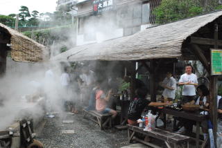![]() (左写真)湯あがりビールがたまらない…汐湯の涼み台 (右写真)素朴な共同浴場で朝風呂も…鉄輪・谷の湯 |