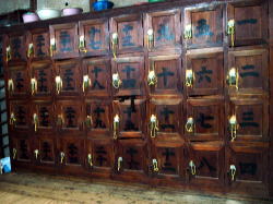 いやまあしかし、いろんな銭湯へ行ってるが、「こんなの初めて〜」のネタは尽きないなあ。 山陽電車「尾上の松」駅から南東へ徒歩10分ちょい、はりま病院の北側に、小ぶりながらどっしりとした伝統建築でたたずむ。 まず赤瓦に黒壁という取り合わせが珍しい。 そして、この看板。こんなデッカイ温泉マークの単品、見たことないねぇ。 しかしこんなのは序の口だ。 夜になったら・・・光りませんでした暖簾をくぐると、狭い下足室も伝統的風景。格子天井、下駄箱、玄関の戸、脱衣場への戸、あがりがまち、ぜぇ〜んぶ木でできております。 ![]() 脱衣場も狭いが、イニシエ度はさらに濃い。 天井はかなり低いが、格子になっていて3枚羽のプロペラがぶらさがる。 ロッカーはケヤキ一枚板の上等品。番台も見るからにいい木を使ってある。レトロ保存度は最高の部類だろう。 そしていよいよ浴室へ・・・どひゃ〜ん、これは驚いた! こじんまりした空間だが、壁がなにやら騒がしい。よーく見ると、関西ではまったくもって珍しいペンキ絵みたいな壁画だ。かなり古びて黒ずんではいるが、アルプスっぽい高山と湖の絵図が、壁の上半分に直接書かれてある。 しかも、ここここれがなんと、前後左右、男女仕切り壁にまでも、四周全部の壁にスキマなく徹底的に書かれてるーーーー!!! そしてその絵のあちこちに、古〜いブリキ板の広告が貼り付けてある。古すぎて波打ってまんがな。 古びたタイル床の中央に排水溝が1本切られ、仕切り壁の下に男女共通の排水口がある。 湯舟は1つ。一部が浅くなっている。 この湯舟のヘリ、ふつーはタイル張りか石づくりだが、ここは洗い出しだ。関西では初めて見るなあ。しかもけっこうジャリが粗い。 粗い光景はまだまだ続く。 壁の穴からは配水の鉛管がムキダシ。 カランは6つあるが、シャワーは立ちシャワー(水。弱し)が1つのみ。 そして、椅子はない。 先客が1人いたが、途中から貸切になった。くすんだ壁画アルプスに我が身を取り囲まれながら、のんびり湯舟に浸かる。 入ったときには番台に人がおらず、あがってから湯銭を払ったのだが、兵庫県の協定料金より20円安い320円だった。 ミニ銭湯にしては、脱衣場には飲み物類がちゃんと置かれているのは好印象。 とかなりディープなわけだが、なんと年中無休で営業しているらしい。うーむ・・・まったくもって意表を突かれる。 とにかくがんばっておられるみたい。 (2004.5.14) |