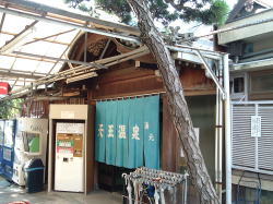 神戸電鉄湊川駅から1kmちょっと。東山商店街を抜け、新湊川商店街も抜け、菊水公園の北側にまわった住宅街の中にある。通りがかりで出会うことはなさそう。 建物は大阪レトロ系に多い凸型玄関。暖簾をくぐると昔ながらの木の上がりがまちと、銭湯組合のポスターの後ろにタイル絵が残っている・・・ようだが、せっかくのタイル絵をこんなポスターで隠してしまうのはもったいないぞ。 タイル教信者の気持ちがわかってないな・・・脱衣場は、けっこう高い格天井と古い木の番台が健在で、昔ながらの前栽や古い体重計などもある。神戸では貴重だ。 ただしロッカーは震災後に入れられたアルミ製でピッカピカ。 浴室に入ると、男女壁側にほぼ正方形+1ヵ所突出の大きな主浴槽がデーン。 床や壁は全面的に改装されていて古さはない。震災後の改装かと思ったが、カラン下などに長いひび割れがあったりもする。おや、震災前なのか? 浴槽のヘリは神戸西部の古い銭湯に多いえんじ色の細かいタイルで縁取られている。 主浴槽は、深・浅・ジェット・気泡・電気の5つのエリアに仕切り壁で分離されている。仕切が水面下5cmくらいまでなので湯は全部共通。こんなに仕切っているのは珍しい。 さらに奥には3〜4人サイズのスチームサウナと水風呂がある。 上がって番台のおばちゃんに聞くと、浴室の改装は震災前だそうだ。築60年の木造建築だが、震災ではビクともせず、地震後3日目に営業を開始した。3日目からの営業は神戸市で4軒だけで、そのうちの1軒だという。 「その日からでも営業しようと思えばできる状態やったけど・・・しばらくは遠方からのお客がズラーッと行列して、たいへんやった。でも今はもうあかんね」 思い出してちょっとしんみりした。 震災時にみんなを救った、古い天井と番台の残る銭湯。小さいわりに設備も多彩だし、なんとなく落ち着けるいいお風呂だった。末永くがんばってほしい。 (2004.5.21) 駅から遠いけど、印象に残る銭湯 |
