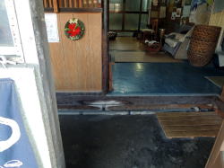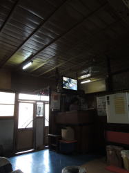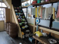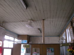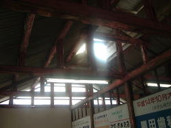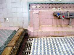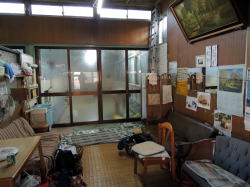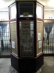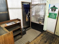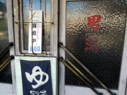 熊本市電の新町電停から西へ3分ほど歩くと、薄緑が薄汚れたような古めかしい2階建てが現れて、それが銭湯だったりする。 ただものならぬ渋さに軽く目まいを起こしまっせ。 ![]() (左)玄関部分が入り込んだようになっている (右)出たナナメの金属取っ手! ![]() (左)ラドンの効能ありがたや〜 (右)戸を開けるとタタキそして脱衣場から浴室まで素通し このエントランスのレトロっぷりが濃いわ深いわもうタダもんやない。 この手のレトロ玄関ではタタキに番台が置かれていることが多いが、ここでは靴を脱いでかまちを上がってからの脱衣場に番台がある。 番台には感じのいいおかみさんが座っている。 ![]() (左)脱衣場から玄関方面 (右)浴室方面 脱衣場もレトロなムードいっぱいで、けっこうモノが多く雑然とした感じ。 印象に残るのは、天井の高さが2段階になっているのと、その段差部分にトラス式鉄橋みたいな補強の梁が入っていることだ。 ![]() (左)手前は天井が低い (右)奥側は高い 天井の高さは80cmくらいの差があるだろうか。 おかみさんによると、この銭湯は昭和12年に建てられ、奥の高いほうの天井部分は当時のまま。手前の低いほうは、昭和40年に改装したときに2階部分を建て増ししたことによる。トラス式の補強もそのときに入れたそうだ。 先客が浴室に2名ほどいるが、脱いだ服は丸籠に入れてそのへんに置かれている。俺もそのようにして風呂場へ。 浴室は奥に細長い。細かいタイルで形成されたイニシエ空間だ。 主湯は奥のほうの男女壁に沿って、手前が深、奥はジェットの2槽。仕切られてはいるが、奥からのジェットの勢いで手前の深風呂へとお湯が押されて流れ込んでおり、そこへ浸かると湯船からザーっとあふれる贅沢構造だ。42度くらいの適温で気色よろしい。 右奥にはバスクリン系の薬風呂。こちらはややぬるめ。 カランにはシャワーもついているが、待てど暮らせど水のまま。ま、この手の激レトロ系にはままあることね。カランからは湯が出るから問題なし。 上がって、パンツ一丁でウメスカッシュを飲みながらしばし放心。なんともいえん時代錯誤感覚に身を任せる。 しかしまー、こんな感じの古びたまんまのマンマ風呂はもう関西ではめったに出くわさなくなったなぁ。 (2013.11.5) |