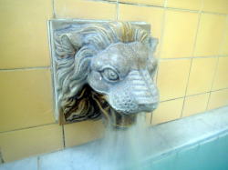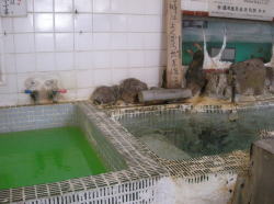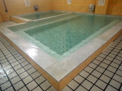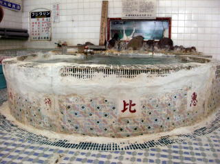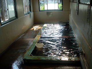 人吉駅から南へ徒歩数分、球磨川の堤防に近いところを歩いていると、こじんまりとした蔵っぽい建物が現れる。その名も「人吉温泉」。これまた雰囲気のある、古いけどちょっとかわいい感じの外観だ。白壁がレトロムード。 さっそく入る。すぐ番台があり、おばちゃんに300円を払ってから靴を脱ぐスタイル。狭い脱衣室にはスチールロッカーがある。 浴室も狭いが、誰もいない。男女仕切り側に4〜5人サイズの古い湯船が一つ。反対側に、湯温自動調節式の真新しいカラン&シャワーが5つくらい並んでいる。かわいいミニ銭湯だな〜。 湯気もうもうそして湯は、おっ、薄いけど黒湯の掛け流しだぞ。トプーンと入る。42度くらいか。湯の触感にはさほど特色はないが、ややツルスベ系。 外はかなり寒くて手足が冷え切っていたこともあって、あぁ・・・こりゃマジ極楽じゃわ。伸ばした体を裏返したり表返ったり。貸切だとこれくらいの広さで十分だな。 湯の注ぎ口にコップが置いてある。飲むと無味無臭。 隅にぬるいかかり湯もある。 (2004.1.24) →人吉旅行記 |