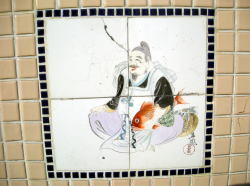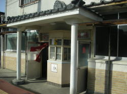 JR荒尾駅から北へ数分歩くと、見えてくるのは四角い白ビル・・・いや、玄関や窓上には瓦の載った小屋根や庇が・・・そして煙突が。 銭湯だ。しかもこれ、出たぞ和洋折衷激レトロ! 番台部分飛び出し型の渋い玄関、そしてその上のタイル屋号が貫禄だ。正面にはえべっさんのタイル絵もあるぞ。 ![]() (左)モダンな造り (右)えべっさん ![]() (左)タイルづくりの屋号が最高 (右)味わい深き表示 入ると狭いタタキで、番台におかみさんが座る。 脱衣場の天井は低めで、島列ロッカーもあるのでやや狭い印象。古い建物だが、そこそこ新建材に換えられている。 ![]() (左)ああこの郷愁 (右)白塗りの板張り天井 ともかく裸になって浴室へ。 と・・・ナント! 中央部に位置する主浴槽様は・・・まぎれもなく前方後円墳ではないか。なぜなんだ。こんなのはじめて見た。 よくわからないが、とにかく絶対これは貴重だ。 白セメント補修が泣ける湯舟のふちには深緑色の細かな長方形豆タイルが貼られているが、手仕事の白セメン補修で半分ほど埋もれている状態だ。浴槽側面には白セメンに埋もれながらも「恵比寿湯」の文字が見える。 セメン補修は床や壁など随所に及んでいる。奥壁には金魚の水槽が埋め込まれているが、このガラスもずいぶんヒビが入っているのを白セメンで強引につなぎとめられている。その半分ほどしかない水の中で、かろうじて金魚が泳いでいる。 応急手当のまま年月が過ぎ、それがもはやこの銭湯の味にさえなっている。 ![]() (左)右奥の金魚水槽まで白セメン補修 (右)排水溝が渋い 湯はぬるめで42度弱。奥に副浴槽があり、緑色の薬風呂になっているが、こちらはもっとぬるい。 床は全面傾斜排水型。排水溝付近にも渋い石が使われている。天井では長方形の湯気抜きがナナメ格子で覆われている。 年代もののあまりB級感は拭えないが、ここでぬるめの湯につかりながら常連のじいさんとポツポツ語らっていると、もう現世も日常も常識もなにもかもがセメンの下だ。 帰りは番台のおかみさんがあまりに気持ちよさげに熟睡されていたため、話は聞けなかった。 (2008.4.8) |