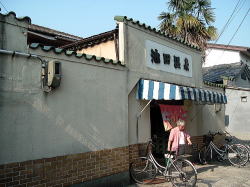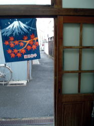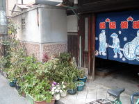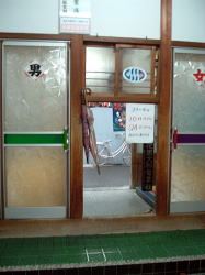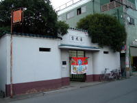 阪急宝塚線の岡町駅を降りると、東側にアーケードの「岡町商店街」がある。 それを1分ほど進むと、ナナメに商店街が交差しており、さらに右に神社の鳥居、左に狭い路地の入口と、複雑な6差路になっているところがある。 その左の狭い路地をちょっと入ってみませう。ほら〜見えるでしょう? 入母屋造りの郷愁系銭湯が。 もうこのロケーションがたまりません。おしっこちびりそう。 ![]() ![]() (左)この左の狭い路地を覗くと・・・ (右)ほら、すぐ正面に・・・ ![]() 暖簾をくぐると、下駄箱は黒と黄のタイガースカラーで塗られている。やっぱ大阪やな〜と思いつつ戸を開けて脱衣場に入る。 ![]() ![]() 脱衣場の天井は格子状で、薄い緑とクリーム色のツートンカラーに塗り分けられている。そしてロッカーは水色と白のツートンカラー。 ツ−トンツートンしているが、まあ全部が黄色と黒でなくてなんとなくホッとした。 浴室は改装されていて、さほどの古さは感じられない。こじんまりしたスペースに、深浅の主浴槽、電気風呂、気泡風呂、そしてスチームサウナがコンパクトに収まっている。スチームサウナは5〜6人サイズと広めで、明るい印象。 浅い浴槽の底に使われているタイルにギザギザがり、それがとても気持ちいい。 夕方5時台から5〜6人の客がいた。古い外観の割に内部は小さいながらも明るくて使い勝手がよく、立地のよさもあってまだまだ現役でいけそうだ。 (2004.4.8) |