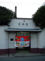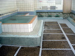 阪急曽根駅から西に商店街を歩いて2分たらず。坂を降りて角を右へちょっと入ったところにたたずむ。界隈も含めて、落ち着いた雰囲気がなかなかいい。 脱衣場は格天井。男女仕切り壁や番台にも昔ながらの味わいがある。小さな庭の風情もいい感じ。 ![]() 浴室は改装されていてさほどの古さはない。 中央に深い浴槽、奥に浅い浴槽(ジェットつき)と電気風呂。浅い浴槽が深い浴槽の倍ほどもあるのがめずらしい。広々していて、子どもを連れて来たくなる。 入ってすぐのところに胸高の壁、その横っちょに鉢水があるのもちょっとかわってる。 奥の壁にあるエンゼルフィッシュのモザイクタイル絵もめずらしいかな。(2004.4.16) |