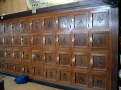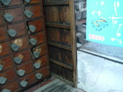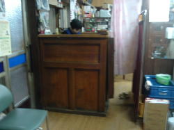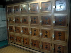 うーん、すごい。もしかしたら大阪最強レトロかも。 近鉄・河内山本駅から徒歩1分。駅前の八幡神社のすぐ北側の通りにある。 外観は、銭湯ファンなら胸がキュンとなるような入母屋造りの伝統建築。しばらくほれぼれと眺めてしまう。 ![]() 内部はこじんまりしている。 木の下駄箱は相当使い込まれてガタが来ており、カギのない箱のほうが多い。 ![]() ![]() (左)下駄箱は箕面の百楽湯にあったのと同タイプ 木の戸も磨り減って丸みを帯びている。入ると番台があるが、番台の上には板が渡されてテレビが置かれており、無愛想な、というより覇気のないおじさんが番台の向かいに椅子を置いてそのテレビを見ている。なるほど。改装しなくてもこうすればフロント風と言えなくもないな。 狭い脱衣場は超クラシックな空間。 黒光りする板張りの床はほとんどお寺の風情。折り上げ格天井には木製の2枚羽プロペラがぶら下がる。木の番台、木の仕切り壁、そして漢数字の打たれた木のロッカー。 古式ゆかしい造りと諸々グッズが現存しているのは素晴らしいが、それぞれ相当キてる感じで、全体的にくたびれ感が濃厚に漂う。 ![]() ![]() 浴室は、うむむむむ・・・駅前でこれが生き残っているのを奇跡と言わずして何と言おう。脱衣場をさらに上回る激レトロな石だらけの世界が展開されている。 天井は男女それぞれが四角錐になっていて、中央に湯気抜き。 男女仕切り壁側に深浅2槽の石の湯船がある。 驚かされるのは湯船のへり外側の段の高さ。ちょうど膝くらいまである。こんなに高いのは初めて見た。 湯船内側の段も石。浅い浴槽はなぜか湯が少なく、しかも内側の半分くらいは石底でさらに浅くなっており、その部分は10cmほどの深さしかない。 ゴールドに輝く真鍮の給水カランは、取っ手のバーに「ツルカメ」と掘られている。 浴室の床も石畳。スキマはたいていタイルがはめ込まれていることが多いが、ここは無骨にセメントで埋められている。 そして中央付近にこれまた石造りの排水溝があるが、普通とは逆に湯船に向かって排水が流れ、湯船のきわに沿って半周してから男女仕切り壁の下にある排水口へと流れてゆく。湯船に沿った部分は溝の幅が狭く、4cmくらいしかないため排水スピードがイマイチ遅い。 カラン付近は四角いタイルが貼られているが、これも年季入りまくり。 さらにもう一つ驚くのは、男女仕切り壁。腰高までは石組み、その上から胸あたりまでは砂利のコンクリ固めだが、その上はなんと木の壁だ。ペンキで青緑色に塗ってある。 普通はタイル貼りなわけだが。浴室に木の壁って・・・これも初めて見たよ。 とにかく、このイニシエ保存度はすごい。素っ裸で古びた石の群れに囲まれて、思わず「ここはどこなんだぁーー!」と叫びたくなる。 客は最初2人いたが、途中から僕一人になった。 こういう銭湯をいつまで、どうやって残せるか。銭湯ファンとして問われているような気がした。 (2004.4.3) ![]() |