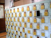 JR阪和線、南田辺の駅前には「スタンドアサヒ」「笑門」と名居酒屋が2軒ある。 で、この銭湯はその駅の北側踏切から西へ徒歩約5分。酔っ払ってプラプラ〜っといきまっしょい。 玄関上が部屋になった無表情な凸型に間口横断パネルと、やや無骨な印象。だが入口は男女別にナナメについている、大阪では珍しいタイプ。 ![]() 写真は2ヵ月ほど後に行ったときのもの(臨時休業だった) ナナメ玄関を入ると普通に下足室だが、なかなかのイニシエ風情。 男女それぞれの入口脇に存在感ばりばりのレトロな体重計が置かれている。こんなところでいきなり体重を量るのかと思うと、「乗らないでください」との張り紙。ムードを盛り上げるために置かれているのだな。 古い木製の戸を開けてはいると、古い番台におかみさんが座っている。 脱衣所は格天井ではないが、全体に古き良きオーラが漂う。ケヤキ一枚板・浮き彫り漢数字の最高級ロッカーがデーンと並び、小さな前栽に外便所という典型的な伝統銭湯だ。 なのに、なんと脱衣所中央にパソコンが置かれているぞ。「小学生は高学年になって上手に使えるようになってから使ってね」と書いてある。これは画期的だ! 浴室へ。出ました! 石畳の床、すきまにタイル市松張り。 湯舟は4つあり、変則的な配置で並んでいるのがイニシエ系としては珍しい。中央に深、横手に浅、正面に電気、奥にジェット。 そして、それらが全部ことごとく白っぽい御影石造り。外側の座り段も石。内側の座り段も石・・・ってこの段、底につくまでズドーンといっとるがな。 とても大阪の市街地とは思えん。太古の昔のままの石に埋め尽くされた、しみじみと泣ける空間だ。 どこもよく磨かれていて大変気持ちよろしい。深とジェットはやや熱め、浅と電気はぬるめ。これに水かぶりを加えて3温交互入浴で魂の再生だ。 出入り口横には男女壁をブチ抜く共用の水鉢と、その横に出ました、そのむかし上がり湯に使われた共用湯鉢! 俺はこいつを「ルルドの泉」と呼んでいる。穴の開いたフタと手桶という伝統的宝物もあり。 「ルルドの泉」には本来は熱湯が入っているもののようだが、ここではぬる湯だった。 上がりは飲み物のほかアイスクリームも売っている。 たいへんくつろげる名銭湯だ。 (2006.2.24) |