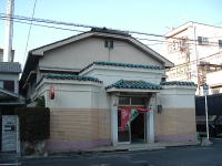 三光湯の前をそのまま通り過ぎ、大通りの1本手前の道を右へ曲がってすぐ。1〜2分しか離れていない。 こちらはこじーんまりした建物だが、なんといってもこの個性的な味わい深い外観。かたちといい色といい、大阪で最も不思議な外観のレトロ銭湯かもね。文字の消えかかった大きな白看板がなければもっといいんだが。 それにしても大正駅周辺は個性的な古銭湯が密集しているなー。 ![]() 暖簾をくぐると石畳、正面に石のカエルと、きれいな花のタイル絵がスッキリとお出迎え。これは好印象だなあ。 ![]() 脱衣場はさほどの古さはなく、まあ普通の感じ。 浴室は茶系の渋めのタイルが多用されている。奥に深・浅ジェットの浴槽があり、手前部分は両側カラン&島カランという、大阪では少し珍しいパターン。入口すみにかかり水槽がある。 おばちゃんがマメに浴室内を片づけているのが印象に残った。 (2004.2.12) |