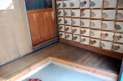世界遺産・姫路城の西側は、古い街並みの残るしっとりとした地区。その一角で風情を盛り上げるナイスな銭湯だ。 姫路駅からお城へ向かってまっすぐ歩く。大手門に突き当たって左(西)へ曲がり、しばらく行くと外堀の市之橋を渡る。そこから2筋目の右手に煙突が見えてくる。 向かいは思いっきりガソリンスタンド・・・うーん、大通りに面しているから仕方ないな。この銭湯も前と横に駐車スペースあり。 暖簾をくぐると、狭い玄関は升目の細かい格天井。 正面に掲げられた「姫路湯屋組合」の看板が泣かっしょるわい。 ![]() ![]() (左)玄関正面 (右)今は「兵庫県公衆浴場組合姫路支部」 おっ、その下の傘立ての背後には小さな富士山のタイル絵だ。 脱衣場へ入ると、低めの番台に60代のおかみさん。小さな空間だが、柱や塗り壁がヒナビた風情をたっぷりと醸し出している。前栽ではヤツデが葉を広げている。 天井は白っぽく塗られた、升目の大きい格天井・・・でも一部の板がめくれてるから合板だな。端のほうで古い扇風機が勢いよくまわっている。 番台・ロッカーは新建材で改装済。ロッカー下には常連の桶がぎっしり並ぶ。 こじーんまりした浴室は・・・古い! 古いよこの空間。 いきなり出ました石畳の床。かなり黒ずんだ石と石のすきまに水色のタイルがはめこまれており、タイル部分が傾斜して溝になっている。 真ん中に味わいのある骨董品的な黒御影の浴槽ひとつ。へりのカマボコカーブがまたエエ感じ。内側の座り段まで石で、一部にタイル張りの浅い部分あり。 周囲の座り段は低めで、ここだけ新しいタイルが張られている。 湯温はややぬるいな。41度くらいか。 そしてなんちゅーても、男女仕切り壁に小さなタイル絵だ。しかも2つ! 右は中国っぽい渓谷をいかだで下る図、左はヨーロッパの高山と湖畔の家、ともにタイル12枚分。 じいさんが湯舟にチャポンとつかって、その絵をぼんやり眺めている。その姿がまたなかなか絵になる。毎日こうしてるんだろな。 その横に「酵素入浴剤・パパヤ桃源」の看板。「当浴場の湯はパパヤ桃源を使用しています」とな。なんじゃそら、とあとで検索してみたらこんなんでした。そういや、ぬるめだがよく温まったような気がせんでもない。 壁の白タイルに「かかり湯をして入ってください」「浴槽内タオルで体をこすらないでください」とマジックで直書きしてあるのはなかなか豪快。 カランは9つあるが、端の2つは水のほうがユルんで飛び散るのかタオルが巻きつけてあるのもまたもや豪快。 カランまわりはイニシエ系の細かい長方形タイルがびっちり。 田舎のプチ銭湯には珍しく、高い椅子や桶(貝印カミソリ)が十分配備されているのは嬉しい。 入ったのは平日7時前、たいてい空いていることの多い時間帯だが、そこそこお客が回転していた。 感心したのは、どのお客も、使った椅子や桶をそれぞれカラン下の段にピタッと片づけて上がること。桶を積んで上がるのはよくある光景だが、ここまできっちり元通りに片づけられているのは珍しい。 古くて小さいけど、みんなに大切に使われてるねんなぁ。シャワーの出もよかったし、湯船もよく磨かれている感じで好印象だ。 ちなみに、女湯は小さなタイル絵ではなく、モザイクタイルの富士山が壁一面に描かれているとのこと。の・・・のぞきたい。 上がりのドリンク販売も、女湯側にだけ冷蔵庫が置かれているっちゅーことだが。許せん。(2004.9.2) |