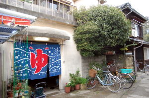 山陽電車の飾磨駅から南へ商店街を200mほど歩き、洋菓子「ロワール」の角を左に曲がると橋がある。それを渡ってまっすぐ約300m、信号の手前にある。 小さな和食店か民宿っぽい外観が感じいい。 ![]() ![]() (左)この地方はれんが造りの四角柱煙突が多く残る (右)風情ある木造の町屋風 建物は古そうだが、下足室は狭いけど下駄箱も新しくてこぎれいにしてある。 脱衣場もかなり狭いうえマッサージ器などもあってやや雑然とした感じだが、格子の天井はけっこう高く、ダークブラウンの桟が美しい。庭のウネウネッと曲がったカイヅカイブキも風情よし。番台のおばちゃんも感じいい。 浴室は脱衣場の狭さに比べると、コンパクトながらもそこそこの広さがある。床や壁は新しいタイルで改装されていて、ボロい印象はない。 男女仕切り壁に沿って小さめの浴槽が5つ並んでいる。奥からジェット、深、浅、「温泉」、水風呂。 ジェット、深、浅はやや熱めの43度くらいか。この3つの浴槽のへりは古い石が使われている。あちこちひび割れてかなりの年季だが、改装時にこの石の湯船だけをそのまま残したあたり、愛着があるんだろうなあ。使い込まれたツルツルの感触は確かに気持ちエエ。 そして、その隣の「温泉」浴槽。2人用の小さなタイル張り浴槽に白濁した湯が張られており、気泡がブクブクしている。壁の説明版には「日本で唯一の泉質、二股ラジウム泉」とある。北海道・長万部の二股温泉の「湯の華」を入れているらしく、その効能・特徴が細かく解説されていて、ほほえましい。 入ってみると、ぬるめの40度くらい。ウムー、これはまろまろっとしてて、キショクええがな〜。 さらに、奥の角にはスチームサウナ(無料)が設置されている。これも2人用のこじんまりしたものだが、座面にしっかりした木のスノコが置かれていてこれまた気持ちいい。 もひとつこの銭湯のポイントは、豆タイル。浴槽外側の腰掛け段にはウグイスの糞色、カラン下の段には濃青緑と、渋い色の豆タイルがびっしり敷き詰められている。タイル教信者としては、もーナデナデ状態。 男女仕切り壁には、鶴と生け花のタイル絵があるが、これは既製品っぽい。でも本物のタイル絵がもう作れないご時世にあってなお、改装に際してこういうのを配置しようというセンスが銭湯ファン心理をくすぐる。 浴室は全体的に清潔感が漂い、古い銭湯にしてはシャワーの湯温・圧力もバッチリ。 この風情で、熱めの主浴槽、ぬるめの温泉、スチーム、水風呂といろんな温度が楽しめ、なおかつ渋い豆タイルとくれば、もう星をつけずにおれませんな。しかもすいてたよ!(平日午後5時前で1〜2人) ゆっくり長湯を楽しめる小銭湯。近所にほしい〜。 (2004.4.22) ※「レトロ銭湯へようこそ関西版」に掲載されました。 |
