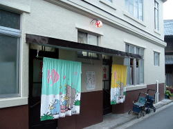 広島市の飛び地・矢野は、山陽本線の海田市から呉線に入って一つ目の駅だ。 駅を出て左へ歩く。小さい川を渡って右を見ると、川沿いの道と、川からナナメ左に逸れていく道とがある。その逸れていく道のずっと先のほうに、四角いれんが煙突が見えるじゃないの。 それを目指して3分ほど歩いたら、この美しい銭湯がきりっと現われる。 辻に立つ洋館風の建物、外壁がきれいに塗られていて高感度高し。 れんが積み角煙突が目印 ![]() (左)美しきレトロモダン調 (右)かわいい照明 暖簾の奥はナナメ取っ手のついた年代物の戸。開けるとタタキにこれまた古い木の番台、ほがらかなおかみさんが座る。 広島の銭湯料金は370円になったが、350円でいいとおっしゃる。 こじんまりとした脱衣所は、中央にテーブルセット。壁や天井は新建材で改装されているが、木のロッカーが渋茶色。浴室入口は広島銭湯らしく水色に塗られ、上部に色ガラスが使われている。 流しなどのにも渋いマジョリカ風のタイルが使われていて、なかなかのイニシエ空間だ。 ![]() (左)木の戸にはナナメ棒の取っ手 (右)木製ロッカー ![]() (左)浴室入口、上部に色ガラス (右)味わい深い流し 大きな木の引き戸を開けて浴室へ。床は細かいタイルが敷き詰められ、壁上部から天井にかけては真っ青なペンキで塗られている。 浴室中央に長方形の湯舟があり、深浅に分かれている。おっ、深いほうは広島名物の内側3段式だ。 もう山歩きでクタクタ、さっそく浸かりましょう。深いほうは43度、浅いほうは41度くらいかな。ピカピカのお湯がなみなみと沸いて、入るとザバーっと溢れる。うっほー、これよこれっ! 湯舟のフチには小さなピンクのカヤック型タイル、ほかにも昔ながらのタイルたちが生きている。回転式の木枠の窓も渋い。 しかし古いけどよく磨かれていて、清潔度は高い。タイルつるつる。 カランは手前と奥壁に並び、奥壁のみシャワーつき。手前の列はワイルドに鉛管むきだしだ。 先客1名のみ、途中から貸切状態になった。 そろそろ上がろうと思って身体を拭いたが、湯舟に沸く気持ちよさげな湯を見るうちに我慢できず、また浸かってしまう。そんな具合でなかなか上がれない。 お客は少なくても、管理がよくて快適。いい銭湯だ。 上がりは飲み物販売あり。 おかみさんによると、お湯は廃材で沸かされているそうだ。「だから石油の値上げも関係ないから350円のままにしてるんです」・・・泣ける。 (2006.8.3) ※「レトロ銭湯へようこそ西日本版」に掲載されました。 2018.11『旅先銭湯』に掲載されました! |