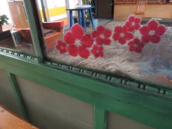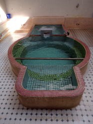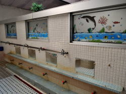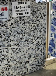 南小樽駅から南西2kmほど山のほうの、奥沢というやや奥まったところにある。 ちなみに俺は小樽駅からあちこち寄りながら1時間以上かけて歩いて行ったけど。小樽駅前からのバスなら「保育所前」バス停の真ん前(奥沢保育所)だから、それを使うのが賢明だろう。 古いが堂々とした建物、そしてカラフルだ。 狭い玄関スペースを抜けて中に入ると間口幅のタタキがあり、年季の入った番台に50歳くらいのおかみさんが座っている。タタキの隅には渋い下駄箱がある。 ![]() (左)玄関入ったとこの細かな珍しいタイル (右)渋い番台 脱衣場はイニシエの風情に溢れている。漢数字の脱衣箱があり、籠は京都式の長方形プラスチック。 浴室入口の上部ガラスに描かれた松と鶴の絵が目を引く。どこかのレストランに飾るために作られたが、どこかに間違いがあって(聞いたけど忘れたスマヌ)、ここに使われることになったそうだ。 エッチングのガラス絵は時々あるけど、こういうのは初めて見たかも。興奮だ。 ![]() (左)昔ながらのよき風情 (右)こういう絵は初めて見た! もうこの時点でテンションがヤバめになってきているのだが、心を落ち着けて浴室へ。 むごー! 真ん中に前方後方中円墳みたいな不思議な形の湯船ポン! なんやのんこのカタチ。前方部は浅く、後方部はジェットが噴出している。 そして男女壁の3ヶ所にイルカや魚の絵が描かれている。これはさっきのおかみさんが描いたものらしい。 ![]() (左)これまた珍しい (右)かわいい絵 壁の上部からダイナミックに三角に抜けた湯気抜き部分はトタンの波板張りで、チープな味わいがなかなかよい。 さて、ここは温泉銭湯ということなのだが、どれ。 お湯は35~36度の源泉を沸かして適温、アルカリ性単純泉。とってもツルツルしている。 たまげたのはカランの湯と水。このぬっるぬるっぷりは、もはや天然リンス状態ではないか。ものすごい名湯やぞこれは! うーむ、もったいなくて上がれんぞ・・・。 これでもかと堪能してようやく上がると、番台には70代後半とおぼしき明るい大おかみに代わっていた。女ぶろは話が盛り上がって賑やかだ。 対照的に男風呂はすいていて、静かにじっくりと湯を楽しむタイプの常連客がポツリポツリといる。 インパクトのあるお湯とともに、さまざまに味わい深い風呂だった。はるばる歩いて来たぶんの3倍返しくらいの値打ちがあった。 男女壁の鏡付近(2016年8月) |