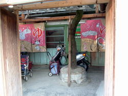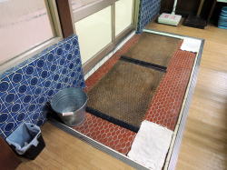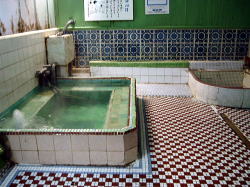 香川県在住の知人から「ここがよかった!」との情報を得ていた激渋銭湯へ、ついに行った。電話帳にも載っていない秘湯だ。 コトデン志度線の終点・志度駅を出て、四国霊場86番の志度寺へ向かう。数分歩けば山門が見えてくるが、その少し手前で右の細い路地を覗くと、煙突が黒い煙を吐いているのが見える。あれだな。 志度寺参道の1本南の通りにあたる路地を抜けて正面へ行くと、角地に小さな祠を従えて、ムンムン漂ういにしえのオーラ。入母屋造りの前に洞窟のごときモルタルの門構え、その中から樫の木かなんかが生えている。 ふ、古い! しかも妙にカチッと存在を示すこの姿。なんかじーんとくるよ。 ![]() (左)玄関横の角に祠 (右)裏手から。壁はパッチワーク状態 ![]() (左)玄関先の看板、温泉マークの下は「画應」? (右)玄関中央から伸びる樹木 門をくぐると中庭には自転車やバアサン手押し車などが停められている。暖簾の奥には青く塗られた木の引き戸。 開けるとタタキに番台があり、おかみさんが座っているが・・・おや? 脱衣所の向こうの浴室が妙に薄暗い。女湯からは談笑が聞こえるが、男湯のお客は誰もおらんし、まさか女湯しか営業してないのか? でも、おかみさんは何も言わないので、男湯もやってるんだろう。湯銭を払って靴を脱ぎ、脱衣所へ上がる。 こじんまりした脱衣所のイニシエ度がまた激烈だ。剥げた白壁に囲まれた濃厚空間。天井は低く、プロペラ(現役)がやたらと近いところにある。出るのは感嘆のタメイキばかりなり。 でもそこはやはり銭湯、はだしになると板張り床が気持ちいい。 ![]() (左)番台周辺 (右)その上部には色ガラス、建った当時はモダンな建物だったのだろう ![]() (左)男女仕切り壁の鏡、緑のベンチもいい味 (右)木のロッカーにはもちろん鍵なし ![]() (左)プロペラ横の天井が一部抜けている (右)浴室方面(あとで電気がついてから撮影) 緑で統一されたガラス戸を開けて薄暗い浴室へ入ると・・・おおっ、こここ、こっこっこ、これは! ここも見事なまでの古さだが、このゴージャスな壁タイルは、かつてオスマントルコかチムール帝国の皇帝が入られた風呂に間違いない。そして床のタイル柄の美しさにもう絶句。 ![]() (左)左が男女隔壁。右下の排水溝には真鍮フタ (右)カラン下の桶置きがテーブル状になっている 皇帝の湯をおそるおそる体にかけ、まず主浴槽に浸かる。42度くらいで、地下水と薪のほのかないい香りがする。アッラー・アクバル! 奥にある扇形の副浴槽には湯が半分しか入っていないが、三角座りするとちょうどの深さになる。皇帝の湯らしくローズマリーの入浴剤入り。やや熱めで、山歩き後にちょうどよろしい。 四角錘天井もこの渋さ途中で電気がつけられた。ゴージャスなタイルがますます妖しく輝く。 シャワーはないが、カランは快調に機能している。 上がりは飲み物販売などないが、砂漠の民はそんなもの平気だ。 おかみさんはいつごろの建物か定かにご存知なさそうだったが、「戦前です」とおっしゃっていた。言うまでもなく十字軍vsイスラム帝国の戦争のことだろう。 四国のお遍路は志度寺に巡礼するが、銭湯狂信徒は迷わずこの観光湯に巡礼しなければならない。それがわれわれフロリアンの民の掟だ。 (2003.3.25) 神殿の出口 |