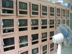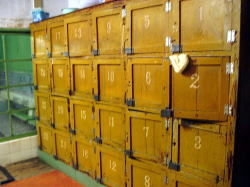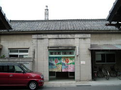 たどり着いて、しみじみ。 しかしまあ我ながらよくこんなところまで来よるわ俺ぁ、アホカイナと。 でもこの風呂へ入ったら思考が180度逆転。俺って最高! 高松からJR予讃線の鈍行に揺られて1時間15分ほど。カトキチ本社のある観音寺市に着く。 駅を出て北へ1kmちょっとだが、駅前通りが途中で終わってたりするので説明がやや難しいな。とりあえず四国霊場69番の観音寺を目指して歩き、三架橋(街のシンボルらしい)より1つ上流の染川橋まで来てください。 財田川を渡るとすぐ観音寺だが、渡らずに右へ土手を歩くと小さな鳥居がある。その向こうに・・・ほら、煙突が白い煙を上げているでしょう。 ![]() (左)横の細い路地を降りてけば嗚呼めぐり会い (右)観音寺の銭湯煙突はみなこのタイプ 外観、かなりキてる感じ。玄関の小屋根がゆがんでるし。屋号はどこにもないが、電話帳によると「たから湯」なので、そうなんでしょうきっと。 おーい、大丈夫か〜でもよく見たら、なかなか味わい深い装飾があちこちに施されている。 ![]() (左)切妻部分に「湯」の大文字 (右)破風の鬼瓦は精巧な松鶴、正面にはチョウチョ 暖簾をくぐると狭い玄関スペースを挟んでまた暖簾。 さらにくぐると狭いタタキ、低い木の番台と鍵付の下駄箱が置かれている。番台には誰もおらん。300円を置いて脱衣所へ上がる。 さわやかな感じ脱衣所も狭い。天井や壁は新建材で改装されている。中央にベンチがあり、隅に2階へ上がる小さな階段がある。 ロッカーは木枠にアクリル板をはめたもの。開けると、底面に1cmほどの高さで金網が設置されている。ほお、これは初めて見るが、清潔感のあるナイスなアイデアだな。 浴室は、脱衣所からすると広め。天井は新しそうなトタン張りで、床は見慣れない渋い色の小さめタイルで覆われている。 男女仕切り側にタイル張りの深浅2槽。ほう、湯は44度くらいあるぞ。俺は関西人には珍しく、熱い湯大好き。今日はさんざん歩いたしな。あ〜気持ちエエ! ほんのり薪を炊く香りが漂う。くつろぐねぇ。湯船のへりの、1cm角のレトロなえんじ色タイルをナデナデしながら、静かにアチチを我慢。 浅い浴槽は41度くらいでどなたさまも入りやすい。 奥に副浴槽、こっちは入浴剤入りで42度くらい、しかも半分は電気風呂。これがなんと電極版が木の板だ。 出入り口の横には水風呂もある。あまり冷たくはない。 カランだけでシャワーはなし。椅子と桶がきちんと整列している。カラン周囲の不ぞろいな小石形タイルがまた昭和ですなぁ。 全体的によく磨かれていて、辺鄙な場所のボロい木造銭湯としては快適度は相当高い。 上がると番台におやっさんが座っていた。牛乳とオロナミンCの販売もあって嬉しいな〜。 ところで営業時間と定休日を確認してくるのを忘れた、スマヌ。僕が行ったのは日曜日の午後3時半ごろ。先客1人、途中で1人、帰るときに1人、という客の入りだった。 観音寺からなら徒歩5分ほど。お遍路の帰りはここでっせ。(2004.9.26)→観音寺旅行記 |