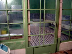 高松での仕事の合間、1時間ちょい時間が空いたので銭湯へ。 コトデン瓦町駅から徒歩数分。観光通りを越えて田町商店街を歩き、アーケードが切れるあたりで左に入る。 外観は、これはレンガを積んであるのかレンガ調タイルなのか、とにかく全面どっしりとレンガチックでなかなか目立つ。いつごろの建物なんだろう。 ![]() (左)側面もレンガ (右)玄関まわりだけ違う 暖簾をくぐると開けっ放しの入り口、その付近もまたレンガ調。 正面に今どきピンク電話が!中へ入るとタタキに番台。そして・・・おー、脱衣所も全面レンガ調で覆い尽くされている。外装と内装が同じというのも珍しい。 しかしここ、使われていない一人用サウナボックスや、ぶら下がり健康器、壊れたマッサージ器、かぶり式ドライヤーなどが無造作に居座っていて、かなり雑然とした濃厚系。 しかも入り口の戸に続いて、浴室の戸も開けっ放し。 ともかく服を脱いで浴室へ。うわー、浴室の壁も徹底的にレンガ調! 湯船は深浅の古い主浴槽、湯はぬるい。40度くらいか? 男女仕切り壁にモザイクタイル絵、これは高松築港にある玉藻公園だな。地方色のあるモザイク絵はなんとなく嬉しい。 奥に入浴剤入りの副浴槽、こっちはもっとぬるい。 出入り口横に水風呂もある。 壁際に並んだカランにはシャワーはないが、奥壁にはカランなしのシャワーだけがいくつか設置されている。 それにしても、ここまでレンガ調で統一された銭湯は初めて。北欧かどっかの山の避難小屋風というか、重厚にしっかりと守られているようなミョーな安らぎを感じる。冬に来るともっといいかも。 ただしカラン前の床がちょっとヌメってたりするのはいただけない。 上がると番台のオバチャンは女湯のお客とのおしゃべりに夢中で、割り込むスキもなかった。 (2004.9.25) |
