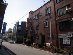 チャガルチ市場近くの宿から、朝風呂を求めてずーっと西まで歩く。 山の中腹のヘドジ路という道をトソン方面へ南下してたら、269番ギルという、エライ坂を上がっていく途中に風呂屋の青煙突発見。 前まで行くと、シンプルで小奇麗でがっしりした感じの建物だ。斜面のため受付は中二階みたいな位置になる。 窓口のおっちゃんがタオルとハブラシとヒゲソリを渡してくれた。ヒゲソリは1000ウォンっぽかったが、俺が外人のせいかサービスしてくれた。女湯1階、男湯2階。 脱衣場ロッカーは木質系。 キレイな脱衣場浴室はすべて石張りで、中央に角が丸くなった長方形の主湯。しっかりと大阪段がある。マタギの外側には白黒のタイルが市松状に張られ、かわいらしい。 その横に出ました、神戸式の汲み出し槽。これにも大阪段と市松タイルが使われている。 石とタイルの端正な佇まい。俺、こういう浴室めっちゃ好みやわ〜。 ![]() (左)脱衣場から (右)汲み出し洗い場。各自が湯水を出して調整式 右奥にデンキとサウナがあるが、サウナに入るとストーブに大きなバケツがかかり、中に薬草が入った袋がぐつぐつ煮てある。これによってサウナ中が香しく、とても幸福な気分になる。 そして韓国名物、広ーい水風呂ももちろんアルネ。 全体に磨き込まれており、韓国銭湯としてはコンパクトながらもハイグレードで心地よい。 浴室は先客1名、あとから3名。 感激したので、帰るときに「サウナがとてもよい香りだった」とおやじさんに伝えた(香り、の部分はジェスチャー)。 男湯はすいていたが、湯上がりにしばらく眺めていたら、おばさん客が次から次へと出てきた。女湯はけっこう混んでいただろう。(2016.3) 坂の上側から見たところ |