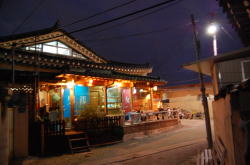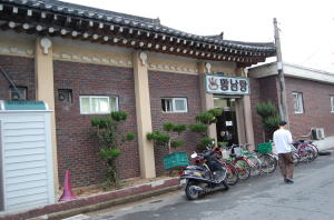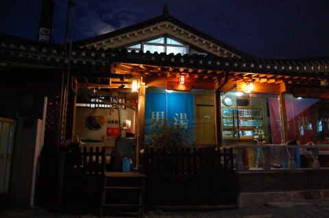 韓国の市街地は直線道路で碁盤目状に整備されているところが多いが、慶州にはうねうね曲がった細い路地がけっこう残っていておもしろい。 そういうところを歩き回りながら、いくつかのビル銭湯をチェックしつつ、中心部の北へ足をのばす。 バスターミナルから20分くらい歩いたかな。慶州文化園から鳳凰路を北へ数分のあたりで、路地の入口に温泉マークつきの看板ゲートを発見した。銭湯か? ![]() (左)温泉マークと文末「タン」の文字が目印 (右)路地を入ってゆくと・・・ 「ワンリムタン」と読めるが、どういう意味かはわからない。「王臨湯」か? 路地の奥に入ってみると、冒頭写真のような建物が現れた。また出ちゃったよ〜ん瓦屋根の平屋建て! ここも古い建物ではなさそうだけど、堂々たる韓屋型銭湯ぢゃありませんかい。 しかもだ。テラス状の入口正面にフロントがあるが、驚いたことに、その左右に、「男湯」と書かれた青のれん、「女湯」と書かれた赤のれんがかかっているではないか。 ハングル洪水に疲れた目を癒しまくる和の情景。ああ、なんてこったい。 フロントには40代くらいの男性がいた。「4000ウォン」と書かれているが、3000ウォンでいいと言う。 日本式ののれんはあるけど、入口はやっぱり韓国式のゴージャスな木製ドア。それを開けて靴を脱ぐ。下駄箱はなくて棚のみ。 脱衣所は日本の平均的銭湯サイズで、真新しく木質系中心で改装されている。床は木製フローリング、ロッカーは縦長だがこれも珍しく木質系だ。そして中央には木の座り台が2つ設置されている。 石とタイルとスチールが目立つ韓国銭湯にあって、ここは日本を意識しているのかもしれん。隅に飲み物自販機あり。 浴室入口の右には韓国定番、自由使用可の布タオルとアカスリタオル、左には冷水器が備えられている。日本の一般銭湯より進んだ嬉しいサービスだ。 でも使い終わったタオルなどが散乱しているのもまた韓国標準。なぜか笑いがこみ上げる。つい片付けたくなるけど、ここは韓流に従おう。 ![]() (左)脱衣所、中央が浴室入口 (右)日本では見られない風景、トイレの戸も開きっぱなし 浴室へ入って、ちょっとたまげた。こんなの見たことないぞ。 浴室の床に、ヒスイのような緑がかった石の板が隙間なく敷かれている。きめこまかでしっとりた、あまり見たことのない石だ。 床だけではない。湯船といわずカラン周りといわず、すべてがこの石で覆い尽くされていて、浴室全体がヒスイの薄い緑色に染まっているのだ。俺は思わず立ちすくみ、しばしほれぼれと見渡した。 浴室の中央に例のくみ出し洗い用の楕円形槽があり、これも全面ミドリ石。でも湯がだいぶ減って、ぬるくなっている。 その右手に浴槽が2つ並ぶ。大阪式座り段つき、もちろんこれもフチから底まで徹底的にミドリ石。でも一つは湯がカラッポだ。壁に「ノクチャタン(緑茶湯)」と書いてある。入りたかったなあ。残念。 もう一つの主浴槽(オンタン=温湯)はちゃんと適温の湯が入っているが、お湯はやや白濁している。そういやこの湯舟、日本の銭湯のようにお湯が湧き上がってないぞ。ていうか穴が排水口しかない。循環装置がなさそうだ。 ははーん、わかったぞ。営業時間はどこにも書いてなかったが、たぶんもう終わりの時刻が近づいているのだろう。まだ夕方5時台やけど。 で、この時間になると緑茶湯は湯が汚れてくるから落としてしまい、そのかわりに値段を3000ウォンに下げていると、こういうわけではないだろうか。 でもそれを確かめるには韓国語力が若干不足しているので真偽のほどはわからない。 湯舟の手前には乾式サウナがある。中には座る台と寝ころぶ板が置かれている。ここでいつものように腕立て伏せをした。 サウナの前には大きな水風呂(ネンタン=冷湯)、チベタくて気持ちええぞ。ここも当然のごとく全面ミドリ石だ。 カランは自動調音の最新式、シャワーつき。どこでもこれが普及しているようだ。でもここでは「シャワー」と「バス(蛇口)」の切り替えが逆になっているのがご愛嬌。 その奥にアカスリスペースがあり、湯舟と反対側には立ちシャワーが4つある。ここにも韓国らしく使用済みタオルやカミソリまで落ちている。 5〜6時、他客は3〜4人ですいていた。中学生くらいの子が一人でのんびり長風呂を楽しんでいる。でも誰よりも俺が長くいた。 そろそろ上がろうかと思っていると、微妙にアンモニア臭が漂ってきた。むっと思ってそっちを見ると、出入り口横にある小便器でじいさんが小便をしている。 浴室の一角に小便器があるというのも韓国ではよく見かけるが、使用者を見たのは初めてだ。しかしなあ・・・。 じいさんはそのまま脱衣所へ出て行った。出たところにも便所があるんやから、もうちょい我慢して体をきっちり拭いてからせえや・・・というのは日本人だけの理屈なのだろう。 出入り口横、小便器の反対側には陶器の大きな壺が置かれ、中には水が入っていてひしゃくが