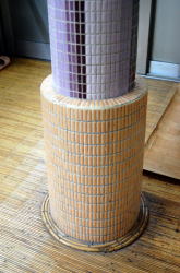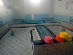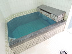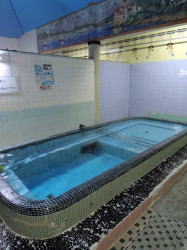 JR鷹取駅から南西へ徒歩10分ちょい。 震災で焼け野原になった駅前通りをまっすぐ歩き、2号線の1筋南の通りを水族園方面へ歩くと、海岸通に出る手前にふいに現れる。 小さいが、四角いコンパクトな外観はちょっと味がある。 暖簾をくぐると、下足室の正面には宝船のモザイクタイル絵のお出迎えだ。 やけにあっさりした宝船脱衣場に入ってまず目をひかれるのは、番台の正面と、その横の入口通路を挟んだ位置にある円柱。1×2cmの細かいタイルがびっちり貼られている。しかもその色が薄紫色なのよね。 めずらしい場所にめずらしい色のめずらしいものが立っている。こいつがなかなか美しい。 ステキな円柱浴室の入口付近もすべて細かい角タイルが隙間なく貼り込まれ、地震で剥げた様子もなく静かに光っている。 ロッカーはアルミ製だが、天井は格天井で、そこから歴史的色彩を帯びた3枚羽プロペラ扇風機がぶら下がっている。 浴室に入ると、いくつか新鮮な驚きが。小さな空間だが、不思議と見どころが多い。 まず、入った正面にかかり湯がある。手前に長い長方形で、この規模の銭湯にしては大きめだ。ここには30度くらいのぬるい湯が張られている。 その背後につながるかたちで、浅・深・ジェットの主浴槽が中央にあり、両サイドが洗い場。床と壁は震災後に貼り直されたっぽい大き目のタイルだが、浴槽は昔ながらの細かいタイル使い。 さらに右手奥には2〜3人サイズのスチームサウナ、左手奥には洞窟風の水風呂がある。スチームサウナ上部の壁には男女ぶち抜きでモザイクタイル絵(アルプスと湖水)がある。 でもいろいろあるわりにゴチャゴチャ感はなく、うまいことコンパクトに配置したなと感心させられる。 天井は男女それぞれが独立した船底になっていて、円形の湯気抜きが1つずつポソッと開いているのが珍しい。 そして、男女仕切り壁の中央と、反対側の壁の中央に、それぞれ1本ずつ、またもや円柱がそそり立っている。しかもここのは太いぞ。そして脱衣場の円柱と同じ細かい薄紫タイルがびっちり。なかなかの見応えだ。 とまあ、古いミニ銭湯にしては妙に味がある。主浴槽を挟んでサウナと水風呂が離れているけど、このスペースでは仕方ないな。 平日の夜7時ごろという空いている時間帯だったが、そこそこお客がいて、みんなけっこう長湯していた。やはり家風呂にはないスチームサウナと水風呂のおかげだろうか。 (2004.2.9) |