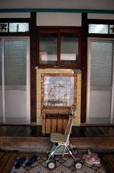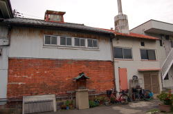 これはちょっと感動したなあ。 JR新長田駅から東へ約1km、国道43号線の東尻池西口交差点から1筋南の角にある。 ぱっと見は古くて小さな下町銭湯だが、震災の激甚被災地だからそれほど昔ながらのものは残っていないだろう、とあまり期待せずに暖簾をくぐってみると・・・。 ![]() (左)浴室側面はレンガ造り。小さな祠がある (右)あがりがまちとタイル絵 おぉ、渋い年代色の上がりがまちと、ウグイスのタイル絵だ。おそらく九谷焼だろう。 俄然、期待に胸がふくらんできたぞ〜。 震災後に入れられたと思われるサッシの戸を開けると、黒光りする木の番台、格天井、年季の入った仕切り壁など、明らかに昭和初期の諸々が現役で生きている。 いやーうれしいねえ。ロッカーや壁の一部は新しいが、これはもしかすると・・・。 神棚も見事!浴室へ。 でで出たあーーー! 石畳の床に石の湯船。 しかも石畳のスキマにはレンガ様のタイルが1列はめてあるだけで、かなりびっちりと石が敷き詰められている。 カラン前に溝がなく床全体が傾斜しているパターンで、最低部分の溝を排水が流れてゆく。 しかもこの溝! こんなとこまで石造りだぞ、これは珍しい。お湯が流れてゆくさまをしばしボーっと眺めてしもたがな。 ![]() 湯船は、手前にメインの深い浴槽、奥に浅いサブ浴槽(座浴ジェットと気泡つき)だが、メイン浴槽のフチには床と同じ石材が使われている。石臼なんかに使われている白っぽい花崗岩ね。 俺はじつを言うと黒御影よりこっちのザラっとした感触のほうが好き。ここへ後頭部を乗せて体を浮かべるんじゃわいな〜。 浅いほうの浴槽には、なつかしの豆タイルが使われている。 さらに、女湯との隔壁をくぐる共用の水鉢もどっしりと石造り。泣ける・・・。 中で女湯とつながる、愛の水鉢女湯との仕切り壁の上に、古いコンクリート造りの飾り屋根というかひさしのようなものが端から端まで乗っている。こいつもレアやなぁ。 壁とカラン周り、浴槽周囲などのタイルは新しい。震災で崩れたんやろか。 シャワーの出はよく、鏡も新しい。 それにしても、これだけ震災前のイニシエな姿が残っているのは奇跡というほかない。 上がって番台のおじさんに聞くと、震災のときは浴室の壁が厚さ10cmにわたって内側へ剥げ落ち、煙突は途中で斜めにずれたそうだ。 いつごろの建物かは、戦後に買い取ったものなのでわからないとのこと。 浴室に使われている石の密度は神戸最強だ。とにかく末長くがんばってほしい。 駅から少し遠いが、わざわざ探して行く価値は十分ある。(2003.11.25) いい!※「関西のレトロ銭湯」(2009年)に掲載されました。 |